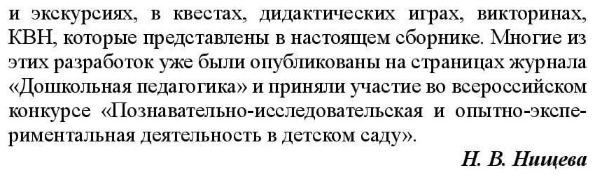 Книга понравилась, есть конспекты, проекты,д/игры по опытно-экспериментальной деятельности , экология хорошо прописана, представлено всего по чуть чуть на каждый возраст. Для воспитателей, будет хорошая методичка. Есть немножко минус, экспериментов представлено мало, а я как раз покупала книгу с тематикой эксперименты и опыты, но для работы мне пригодится, буду пользоватся с удовольствием.