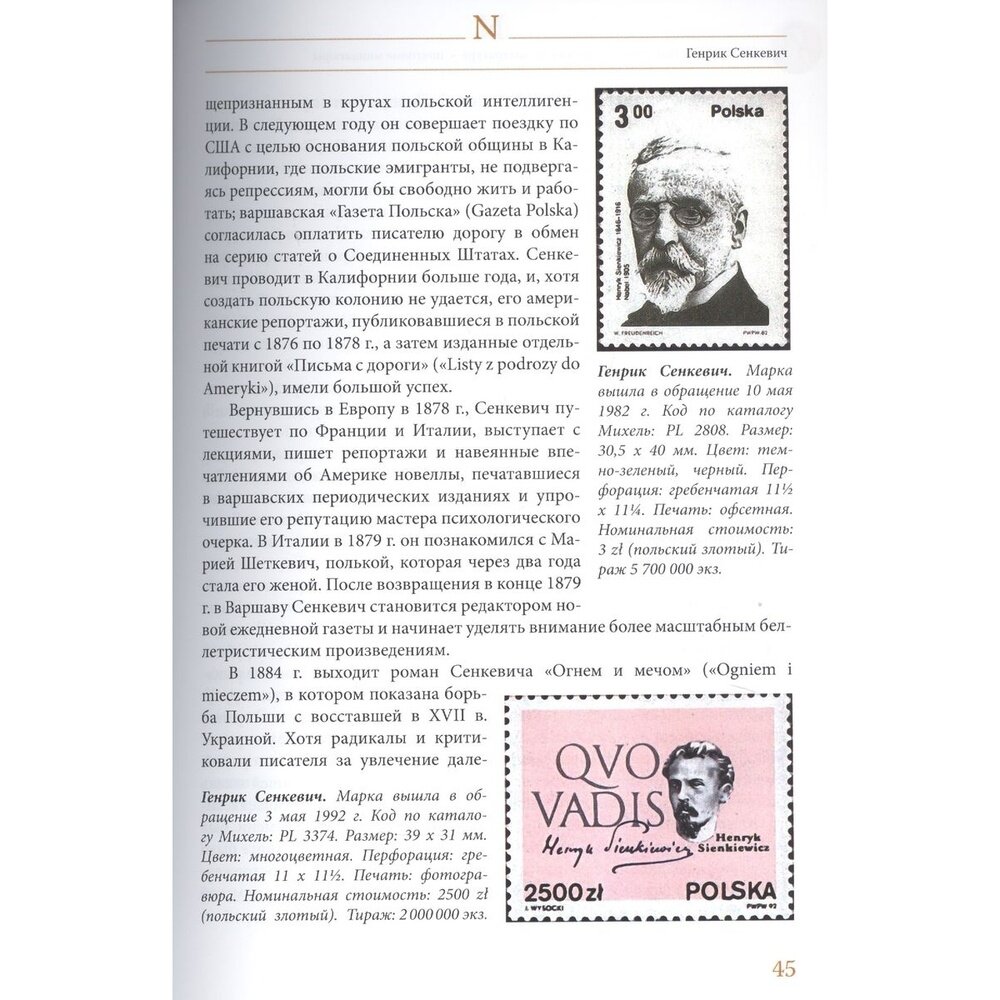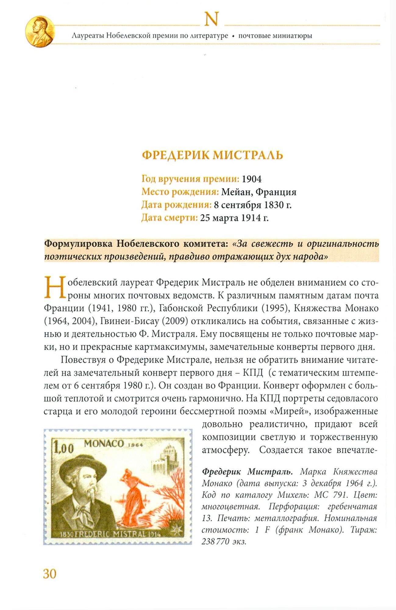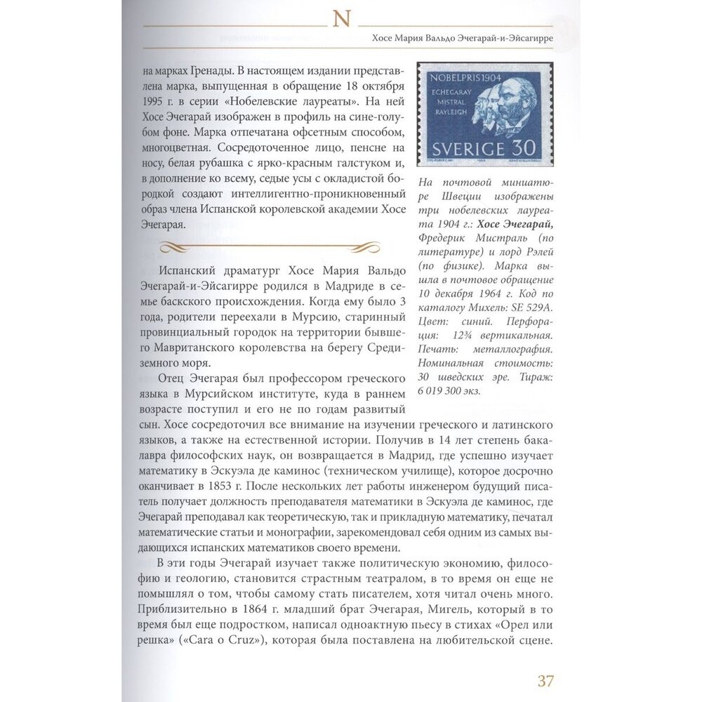 Издание содержит сведения о нобелевских лауреатах в области художественной литературы (1901-2019 гг.). Книга знакомит читателя с краткими, наиболее важными вехами из творческой жизни писателей, удостоенных за свой труд этой высокой награды и получивших международное признание. Особенностью данного издания является и то, что портреты лауреатов, представленные в книге, изображены на почтовых миниатюрах. А, как известно, почтовая марка - это визитная карточка государства. На разнообразных (по размеру, цвету, зубцовке, номиналу и другим параметрам) марках и почтовых блоках предстают перед читателем эти выдающиеся люди - творцы литературных шедевров. В приложении приводится краткий словарь филателистических терминов. Книга рассчитана на широкий круг читателей, интересующихся литературой, историей и филателией. Биографические данные и литературная критика приведены с использованием материалов сайта noblit.