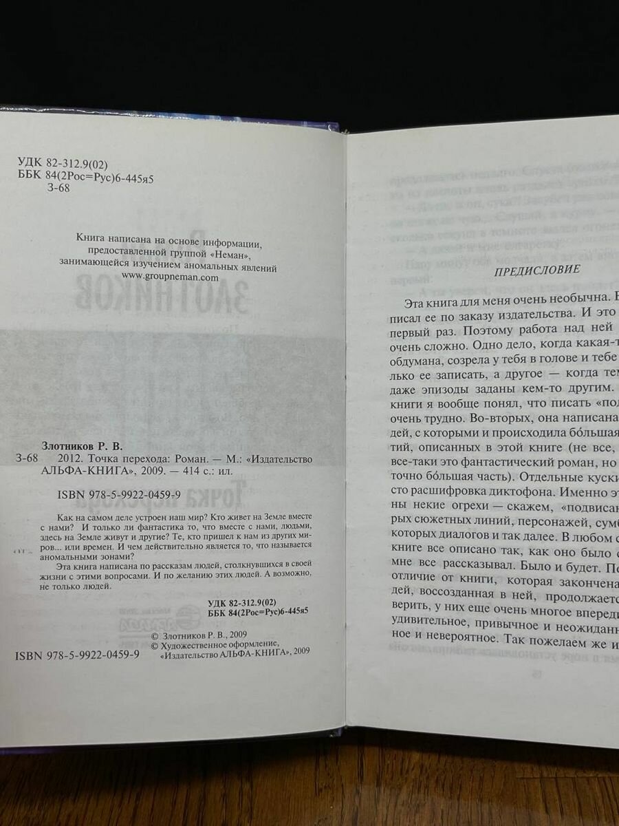 Хочу заметить, что Злотников работал по заказу группы исследователей аномальных явлений “Неман” на основе предоставленных ими материалов и сделал свою работу очень качественно, но от самого писателя в “Точке перехода”, к сожалению, почти ничего не осталось.