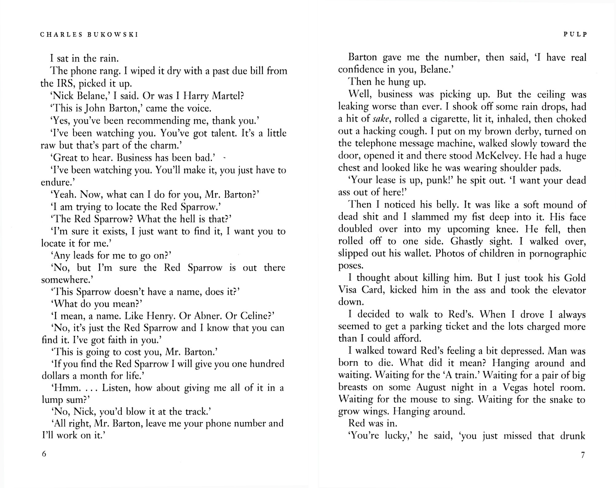 Nicky Belane, private detective and career alcoholic, is a troubled man. He is plagued not just by broads, booze, lack of cash and a raging ego, but also by the surreal jobs he's been hired to do. Not only has been hired to track down French classical author Celine - who's meant to be dead - but he's also supposed to find the elusive Red Sparrow - which may or may not be real.