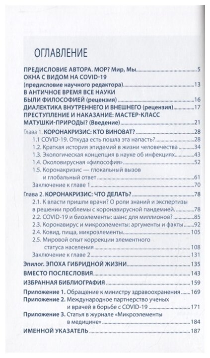 В третьей книге из серии "Записки философствующего врача" представлено авторское видение проблемы коронакризиса с позиций учёного, практикующего врача и педагога. В монографии дан анализ социальных процессов возникновения инфекций, их роль в истории человечества. С точки зрения общебиологических, экологических подходов к причинности эпидемий рассматриваются различные аспекты коронакризиса. В книге сделан акцент на роли макро- и микроэлементов, витаминов, в первую очередь цинка, селена, витамина D, антиоксидантов в профилактике COVID-19, лечении и восстановлении пациентов. Подчеркивается, что это один из немногих путей решения проблем коронакризисного мира. Важно отметить, что автор является авторитетным специалистом мирового уровня в области биоэлементологии и медицинской элементологии, что повышает ценность представленных читателям сведений самых последних научных и практических достижений.