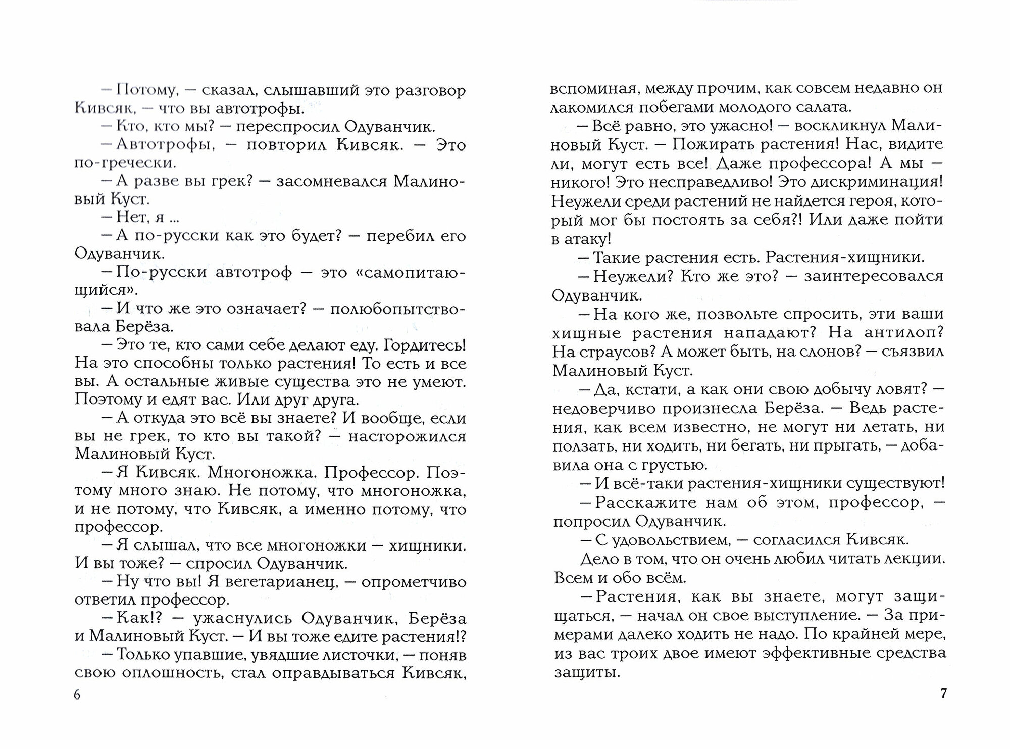 Герои "Зоологических сказок" - различные животные. На страницах этой книги юные читатели встретятся со словоохотливым лектором Кивсяком, с мудрой Голотурией, со странными Рыбой-Солнцем и Рыбой-Луной, со сладкоголосой Сиреной, с Японским Крабом, сочиняющим стихи, с крохотным гекконом Дюймом, который мог благодаря естествоиспытателю Ван дер Ваальсу ходить по вертикальным стенам, познакомятся с самым обыкновенным котом, ухитрившимся побывать в шкуре могучего льва, с маленьким попугайчиком по имени Динозавр, с волшебной рыбкой Вуаля, с гремучей змеёй, способной предсказывать будущее, с серой жабой, из-за которой был разрушен город и со многими другими удивительными персонажами