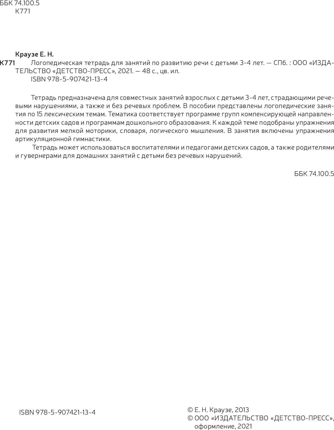 Логопедическая тетрадь для занятий по развитию речи с детьми 3-4 лет. (Краузе Елена Николаевна); Детство-Пресс, 2021