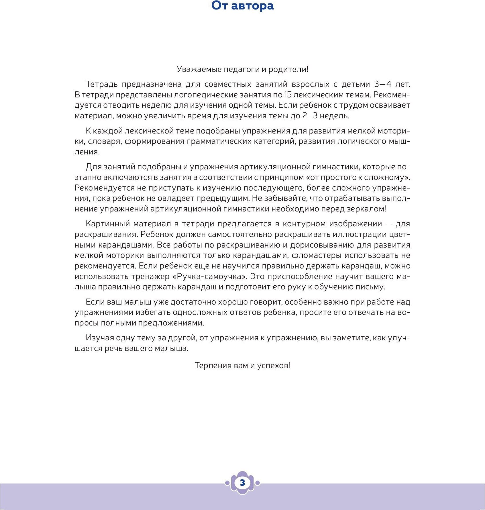 Тетрадь предназначена для совместных занятий взрослых с детьми 3-4 лет, страдающими речевыми нарушениями, а также и без речевых проблем. В пособии представлены логопедические занятия по 15 лексическим темам. Тематика соответствует программе групп компенсирующей направленности детских садов и программам дошкольного образования. К каждой теме подобраны упражнения для развития мелкой моторики, словаря, логического мышления. В занятия включены упражнения артикуляционной гимнастики.
