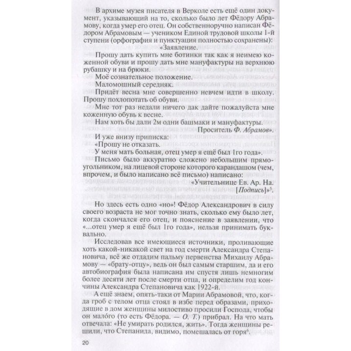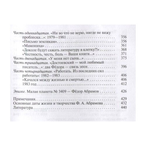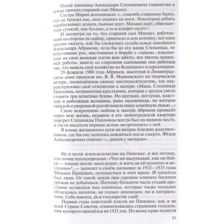 В основу жизнеописания положены не только воспоминания тех, кто знал писателя, но и материалы, хранящиеся в Санкт-Петербурге, в личном архиве Ф. А. Абрамова ИРЛИ РАН (Пушкинский Дом). Автор книги - писатель, историк Олег Дмитриевич Трушин впервые исследовал данный архив, что помогло ему раскрыть множество новых фактов, касающихся литературной деятельности, а также узнать подробности личной жизни писателя, прежде представляющие тайну.