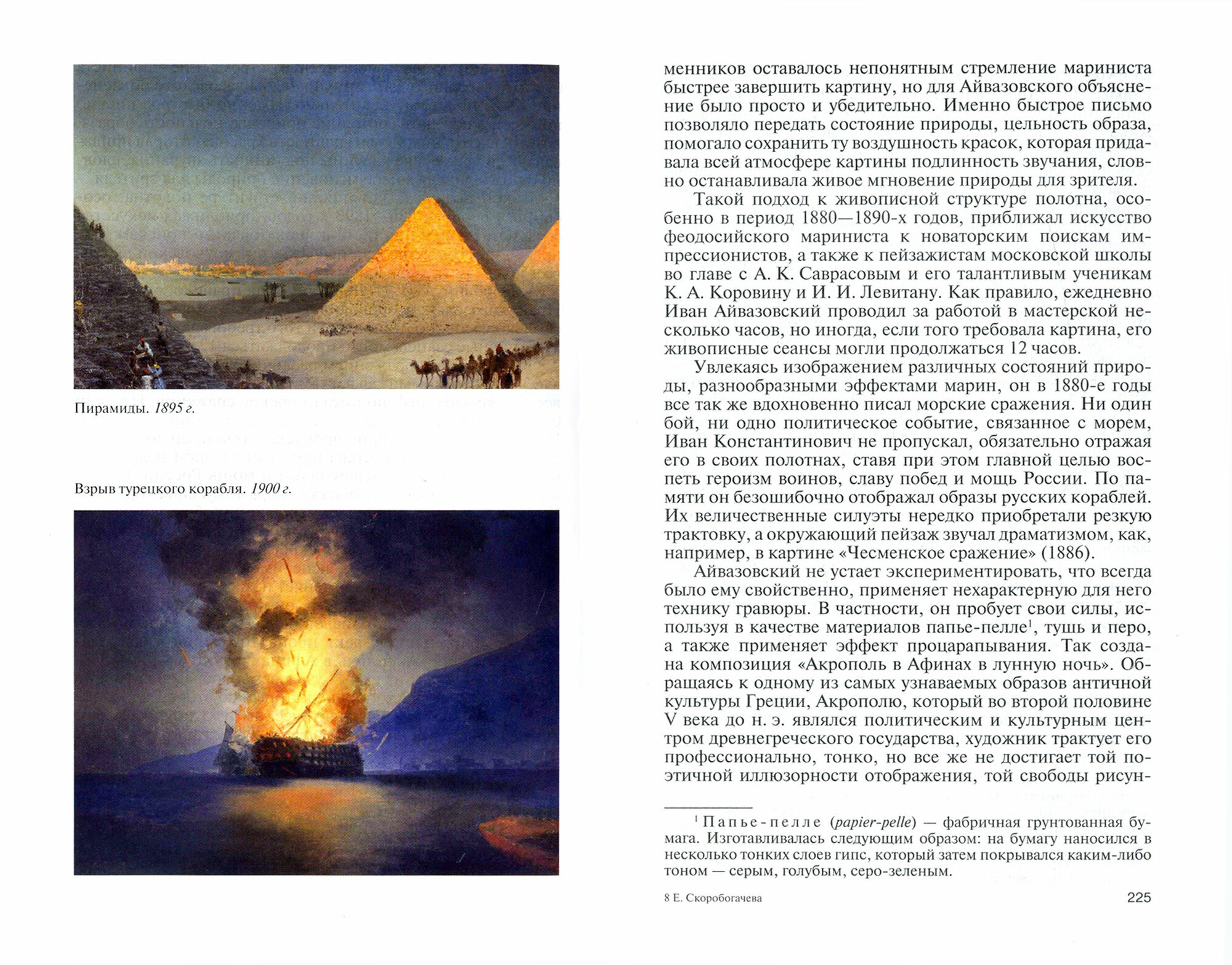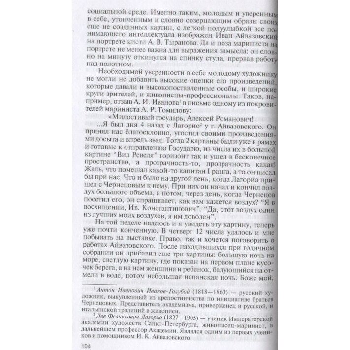 Очень хорошая книга, которая поможет поближе познакомиться с великим русским художником. Содержит в себе полную биографию автора с интересными моментами из жизни. Издание добротное, твердый переплет, плотные, белые листы, комфортный шрифт, фотографии и цветные репродукции знаменитых картин Айвазовского. После прочтения раскрывается такая трепетная любовь к морю от художника :)