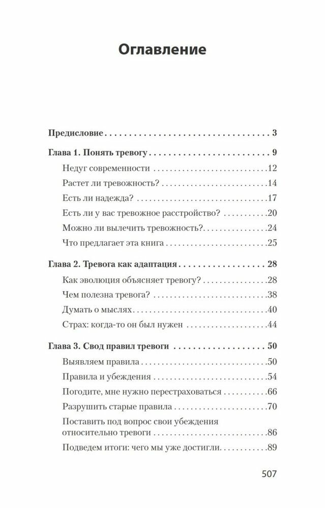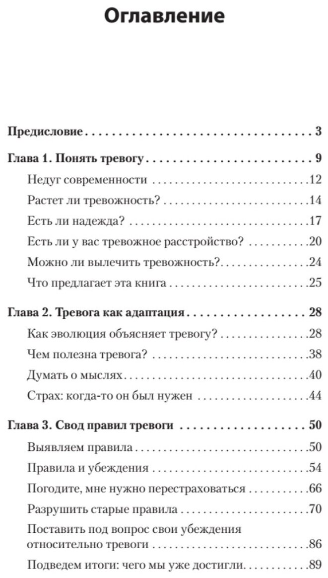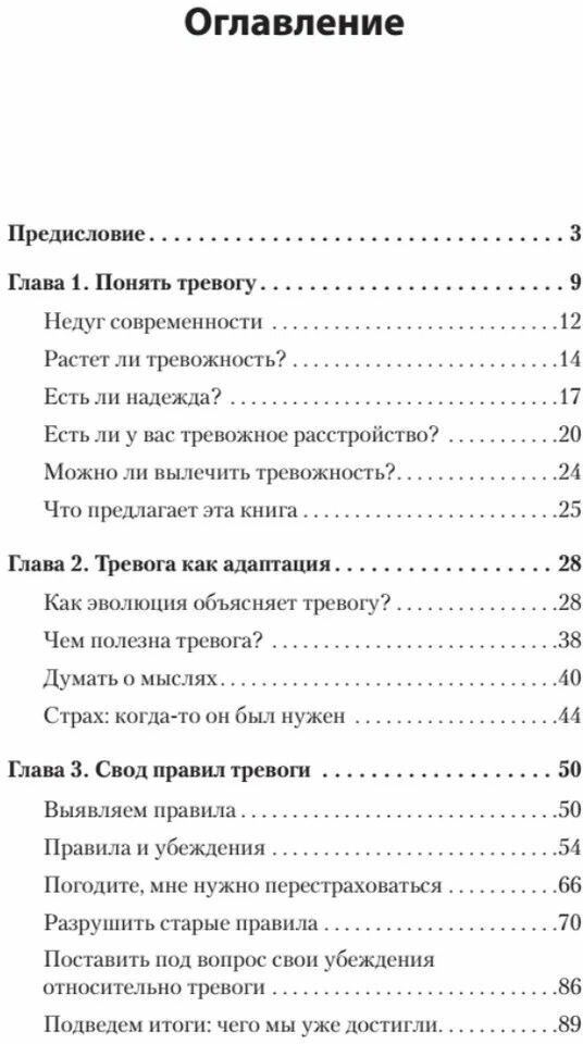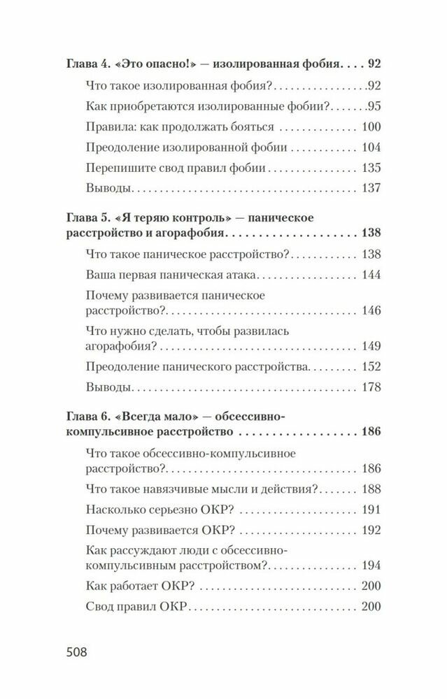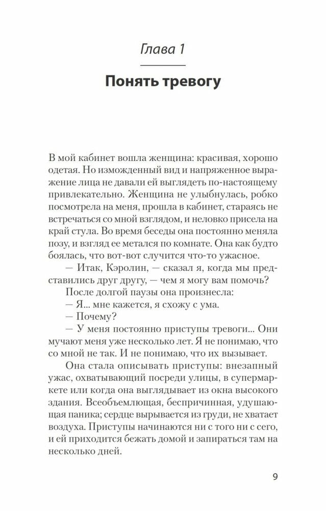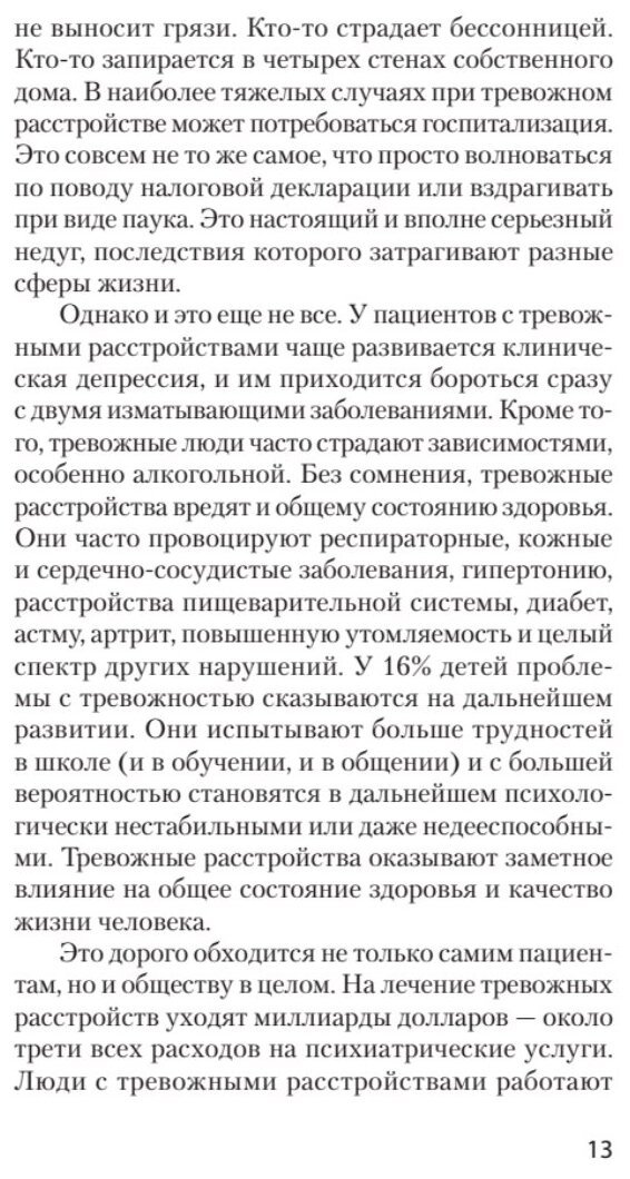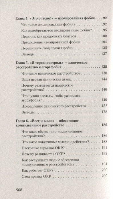 В шести главах - с четвертой по девятую - описаны способы оспаривания деструктивных идей, подробно рассмотрены каждые из шести тревожных расстройств. В каждой из глав найдете пошаговую инструкцию по применению техник борьбы с тревогой. В приложении автор собрал ряд диагностических опросников.