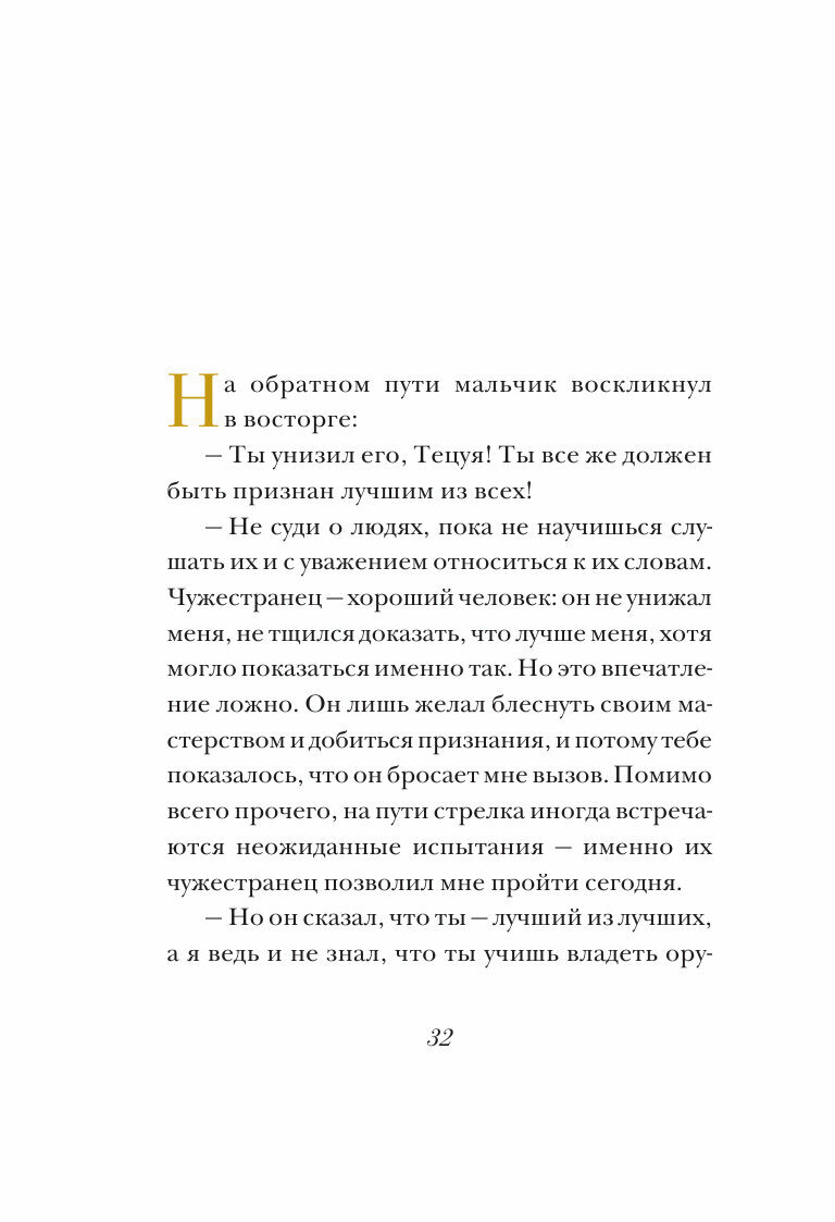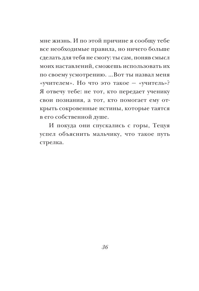 Прекрасная притча про Путь, которым следует идти. Как человек, который разделяет ценности героя – буддизм и стрельбу из лука – советую не попадать в ловушку, которую расставил автор. Радость от работы или от стрельбы из лука – неважно – приходит лишь после охрененно трудного периода совершенствования техники. Не каждая птица долетит до середины Днепра)). Также чушь, что достаточно лишь «показать Путь». Человеку нужен человек, прав был Антон Павлович.
