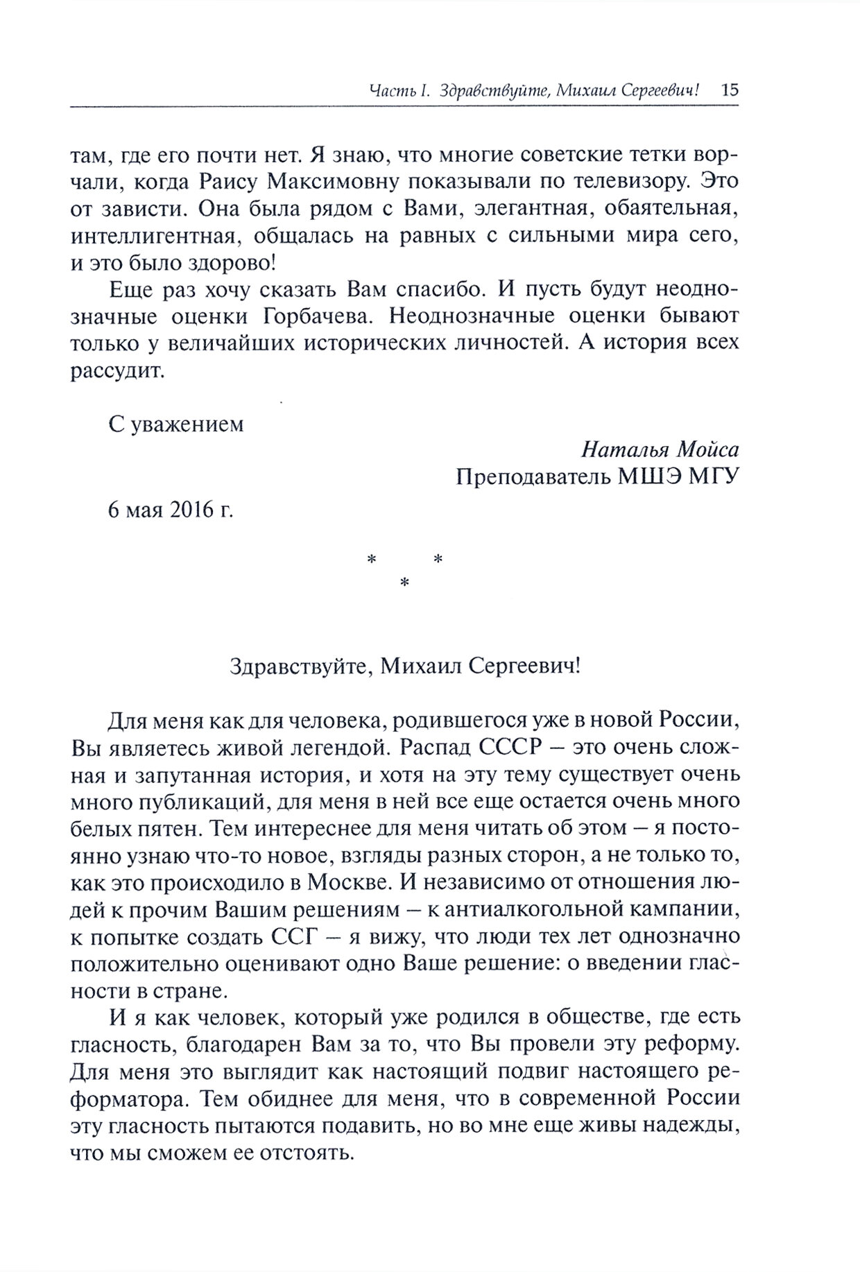 Сборник приурочен к 90-летию М.С. Горбачева. Письма, отобранные для этой книги, дают достаточно полное представление о том, что интересует, волнует людей, которые благодарны Горбачеву – политику и хотят глубже понять значение того, что сделано им для России и мира. Бoльшая часть писем публикуется впервые. Книгу открывает интервью Горбачева пресс-секретарю Горбачев-Фонда В.А. Полякову от 30.12.2020.