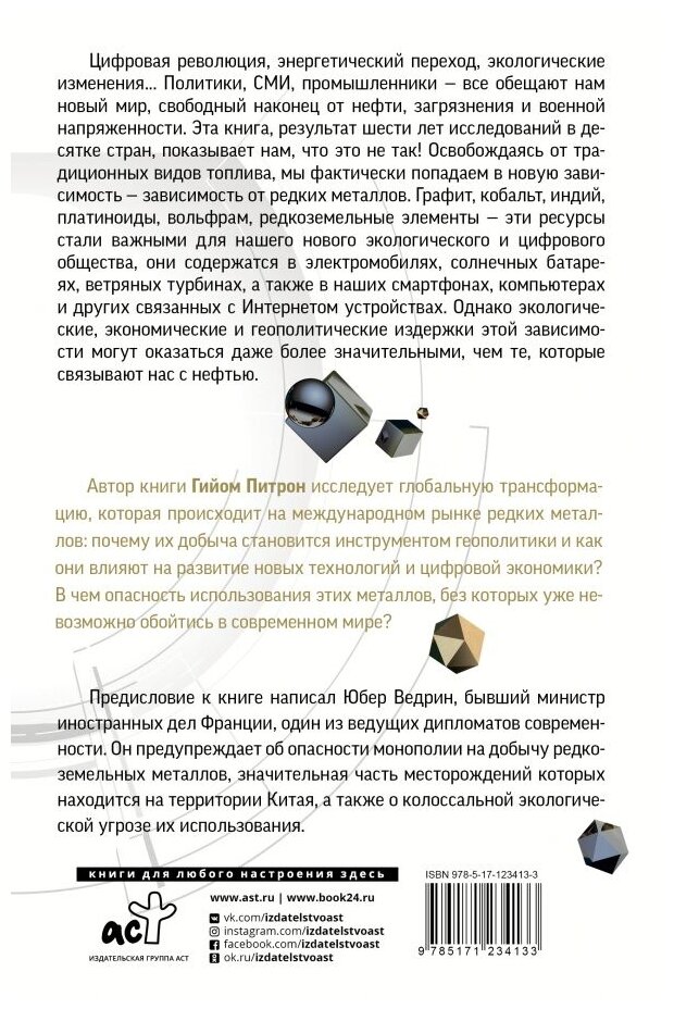 Автор книги Гийом Питрон исследует глобальную трансформацию, которая происходит на международном рынке редких металлов: почему их добыча становится инструментом геополитики, и как они влияют на развитие новых технологий и цифровой экономики? В чем опасность использования этих металлов, без которых уже невозможно обойтись в современном мире?