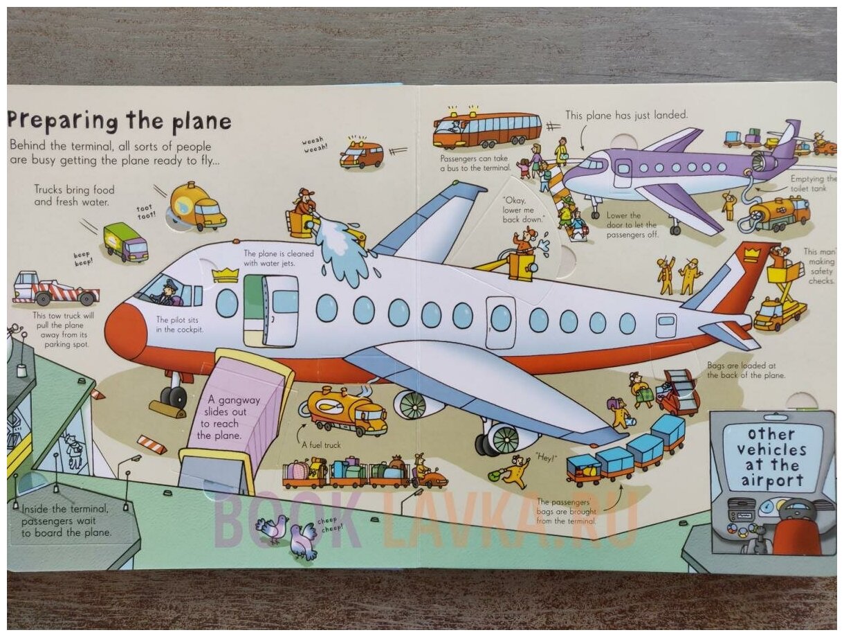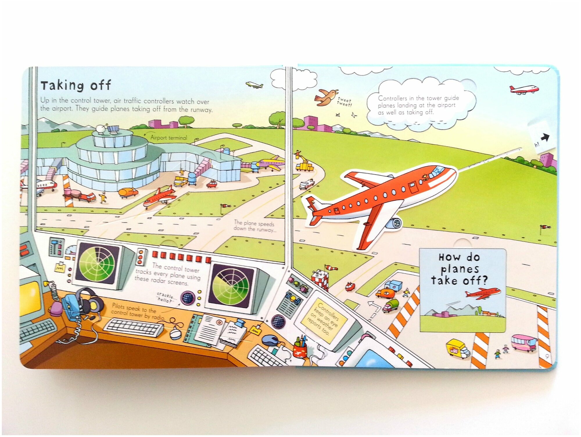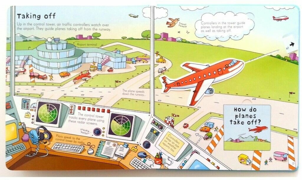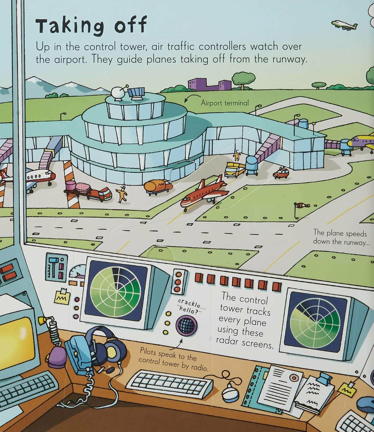 Великолепная книга большого формата от известного издательства Usborne. Книга из плотного картона с множеством флэпов про аэропорт и все, что с ним связано. Книга наверняка понравится мальчикам и их папам и не только, тут много технических определений и различных описаний про устройство аэропорта. Рекомендую!