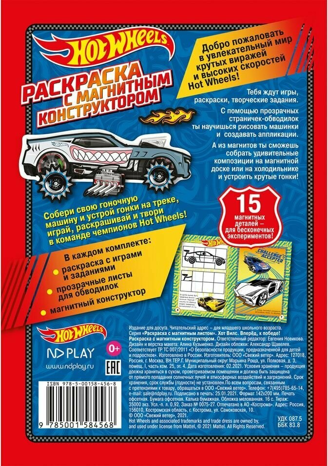 Раскраска "Хот Вилс. Вперед, к победе!" с магнитным конструктором из 14-ти деталей. Ребенка ждут увлекательные игры, раскраски и творческие задания. Раскраски Hot Wheels с изображением любимых героев способствуют развитию мелкой моторики, образного мышления и, разумеется, усидчивости и внимательности. С помощью прозрачных страничек-обводилок ребенок научится рисовать машинки и создавать аппликации. А из магнитов можно собирать удивительные композиции на магнитной доске или на холодильнике и устроить крутые гонки. Много магнитных деталей для бесконечных экспериментов!