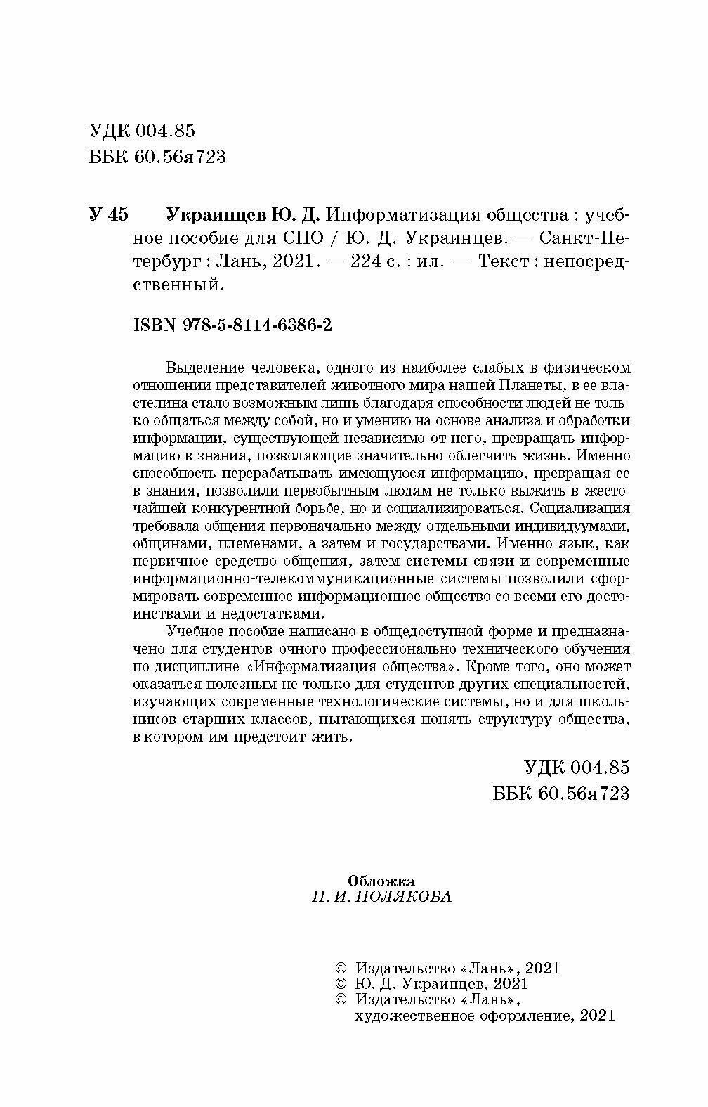 Информатизация общества. Учебное пособие для СПО (Ю. Д. Украинцев); Издательство ЛАНЬ, 2021
