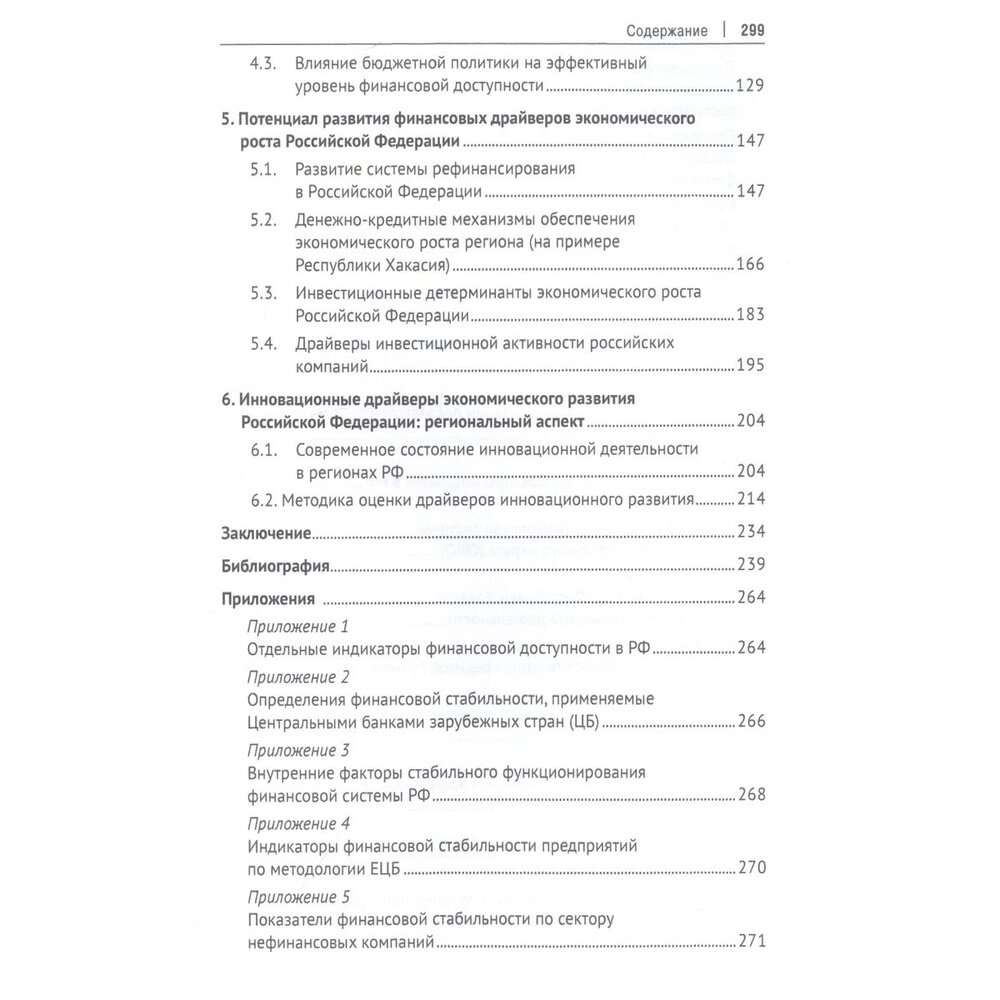 Разобраны ключевые источники угроз финансовой стабильности, характерные для российской экономики. Предложены новые подходы к мониторингу финансовой стабильности предприятий (компаний нефинансового сектора). Представлена оценка механизмов управления финансовой доступностью с применением инструментов денежно-кредитной и бюджетной политики. Раскрыто значение региональной банковской конкуренции в достижении равномерной финансовой доступности. Оценен потенциал финансовых драйверов экономического роста, основными из которых для России являются развитие инновационных институтов и системы рефинансирования коммерческих банков. Даны рекомендации по преодолению выявленной неэффективности государственной финансовой политики в отношении депрессивных регионов. Показаны перспективы раскрытия инновационного потенциала российских регионов. Изложена методика оценки инновационных драйверов экономического роста РФ.