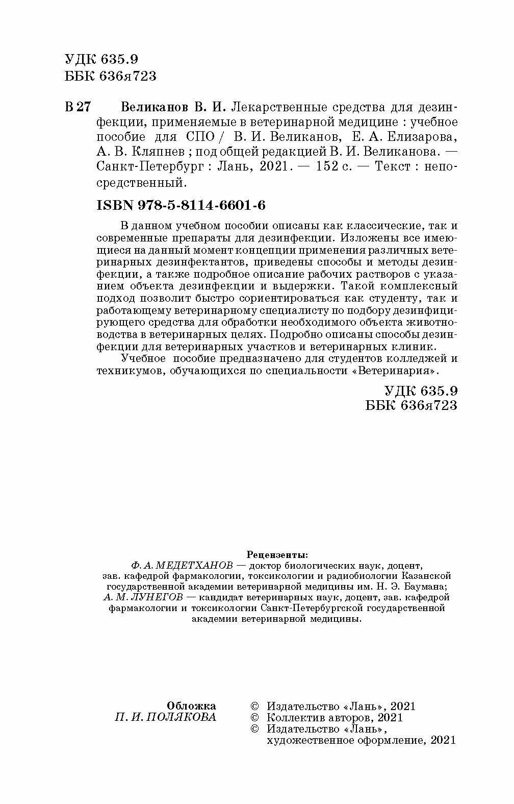 Лекарственные средства для дезинфекции применяемые в ветеринарной медицине (Великанов Валериан Иванович, Елизарова Елена Анатольевна, Кляпнев Андрей Владимирович); Лань, 2021