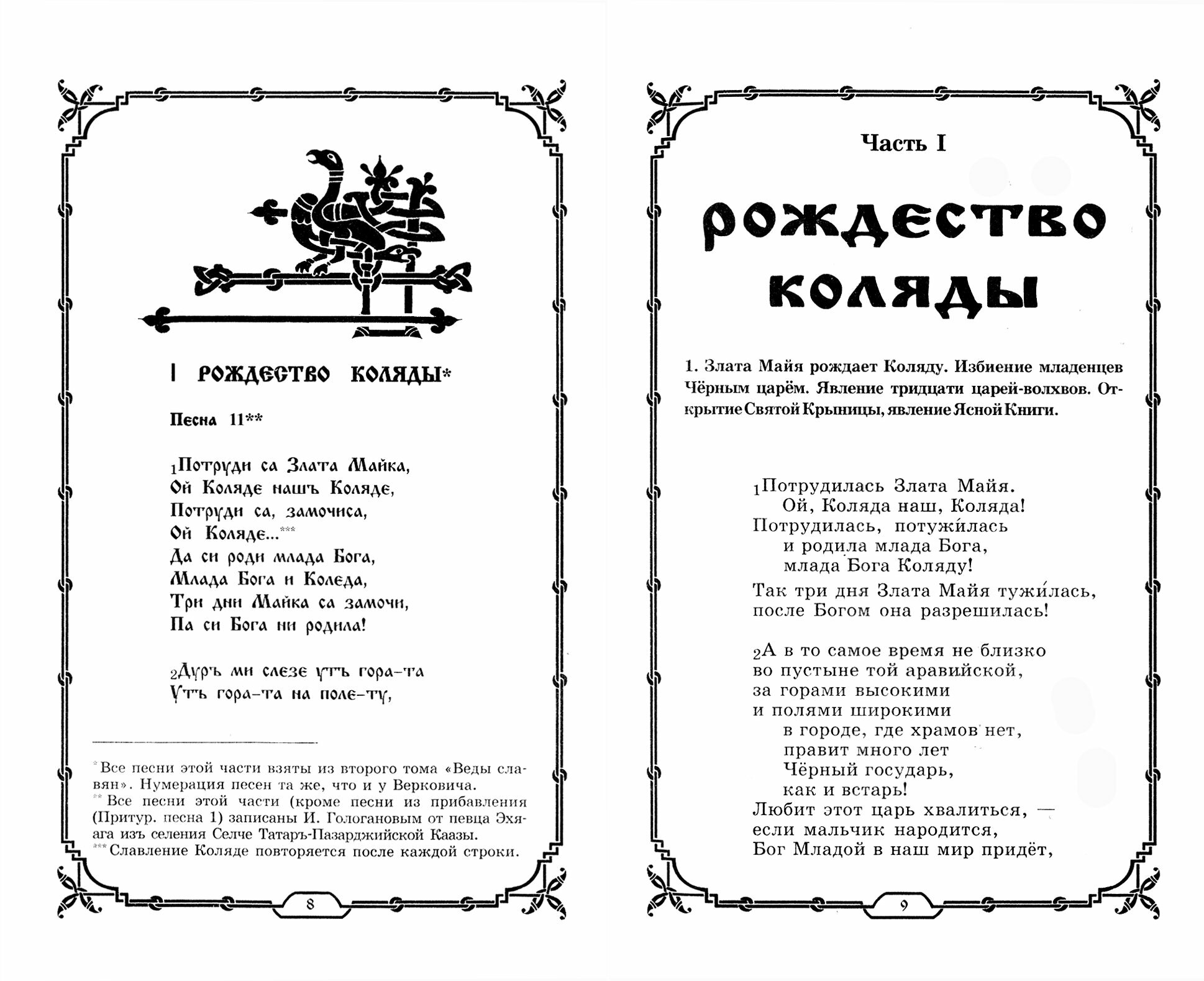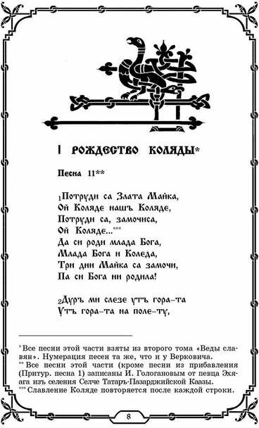 Эта книга принадлежит к той же традиции, что и "Книга Велеса". Здесь впервые публикуются русские переводы текстов ведических преданий и песен, собранных в Родопах в середине ХIX века южнославянским учёным Стефаном Ильичом Верковичем. Часть этих песен была им опубликована на болгаро-помакском языке в книге "Веда словена". Первый том "Веды словена" вышел в Белграде в 1874 году, а второй - в Санкт-Петербурге в 1881 году. Издание второго тома, а также продолжение работ по сбору ведических славянских преданий осуществлялось на средства императора Александра II и русских ревнителей науки о славянских древностях. Здесь впервые публикуются также песни из третьего тома, оставшегося неизданным в XIX веке.