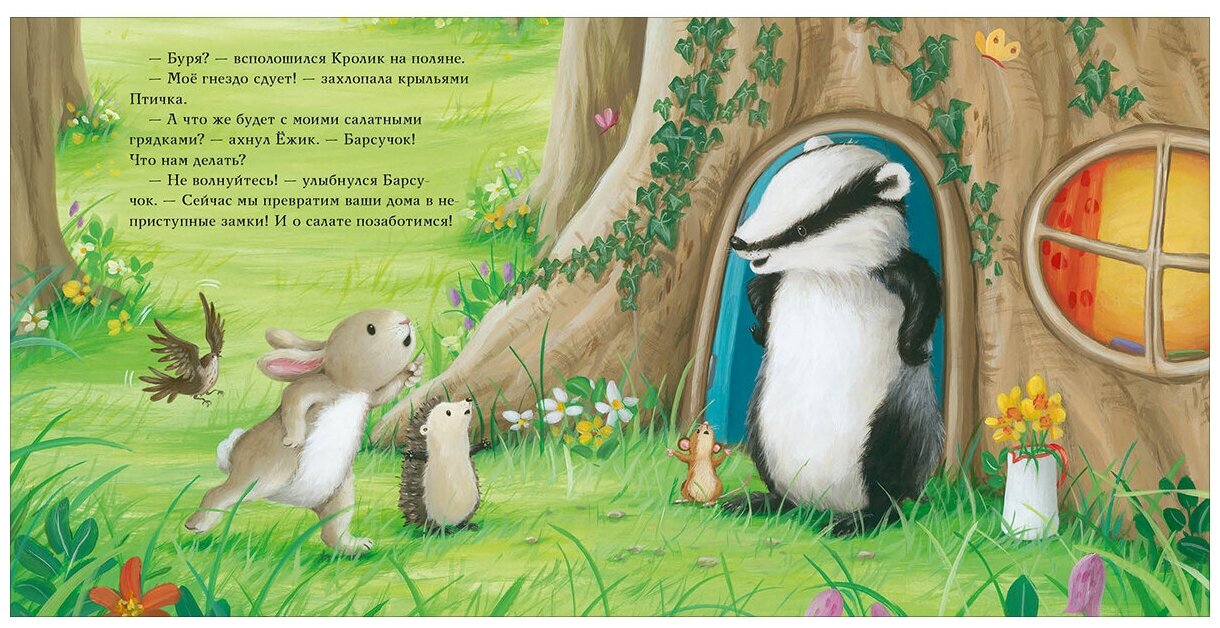 Книги про барсучка от иллюстратора Кэролайн Педлер про шикарные. Вся серия книг о взаимопомощи и находчивости умело барсучка. Также постоянными героями книг являются ёжик и зайчик. В книге про большую бурю, находчивый барсучок помог каждому другу укрепить его домик, но тут дерево в котором жил сам герой упало и он остался без домика, но барсучок не унывал и построил себе новый домик и все все ему в этом помогли