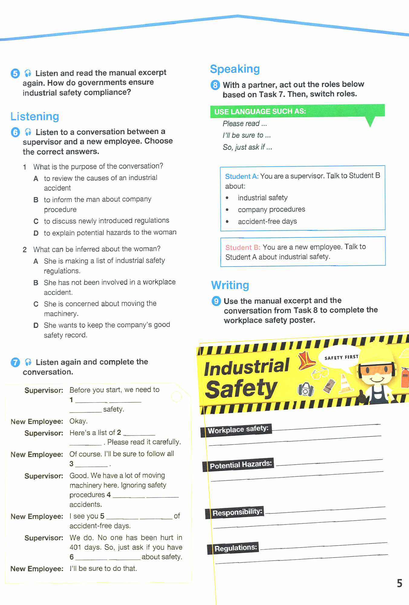 Career Paths: Industrial Safety is a new educational resource for industrial safety professionals who want to improve their English communication in a work environment. Incorporating career-specific vocabulary and contexts, each unit offers step-by-step instruction that immerses students in the four key language components: reading, listening, speaking, and writing. Career Paths: Industrial Safety addresses topics including parts of a factory, inspections, safety equipment, emergency response, and handling chemicals.