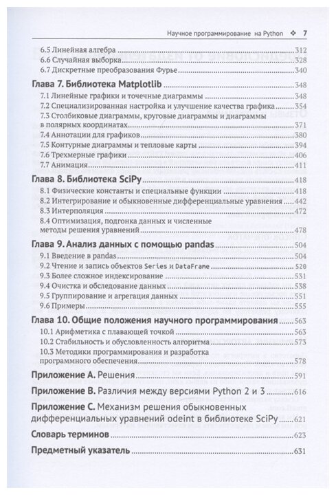 Книга начинается с общих концепций программирования, таких как циклы и функции в ядре Python 3, затем рассматриваются библиотеки NumPy, SciPy и Matplotlib для вычислительного программирования и визуализации данных. Обсуждается использование виртуального блокнота Jupyter Notebooks для создания мультимедийных совместно используемых документов для научного анализа. Отдельная глава посвящена анализу данных с использованием библиотеки pandas. В заключительной части представлены более сложные темы, такие как точность вычислений с применением чисел с плавающей точкой и обеспечение стабильности алгоритмов.