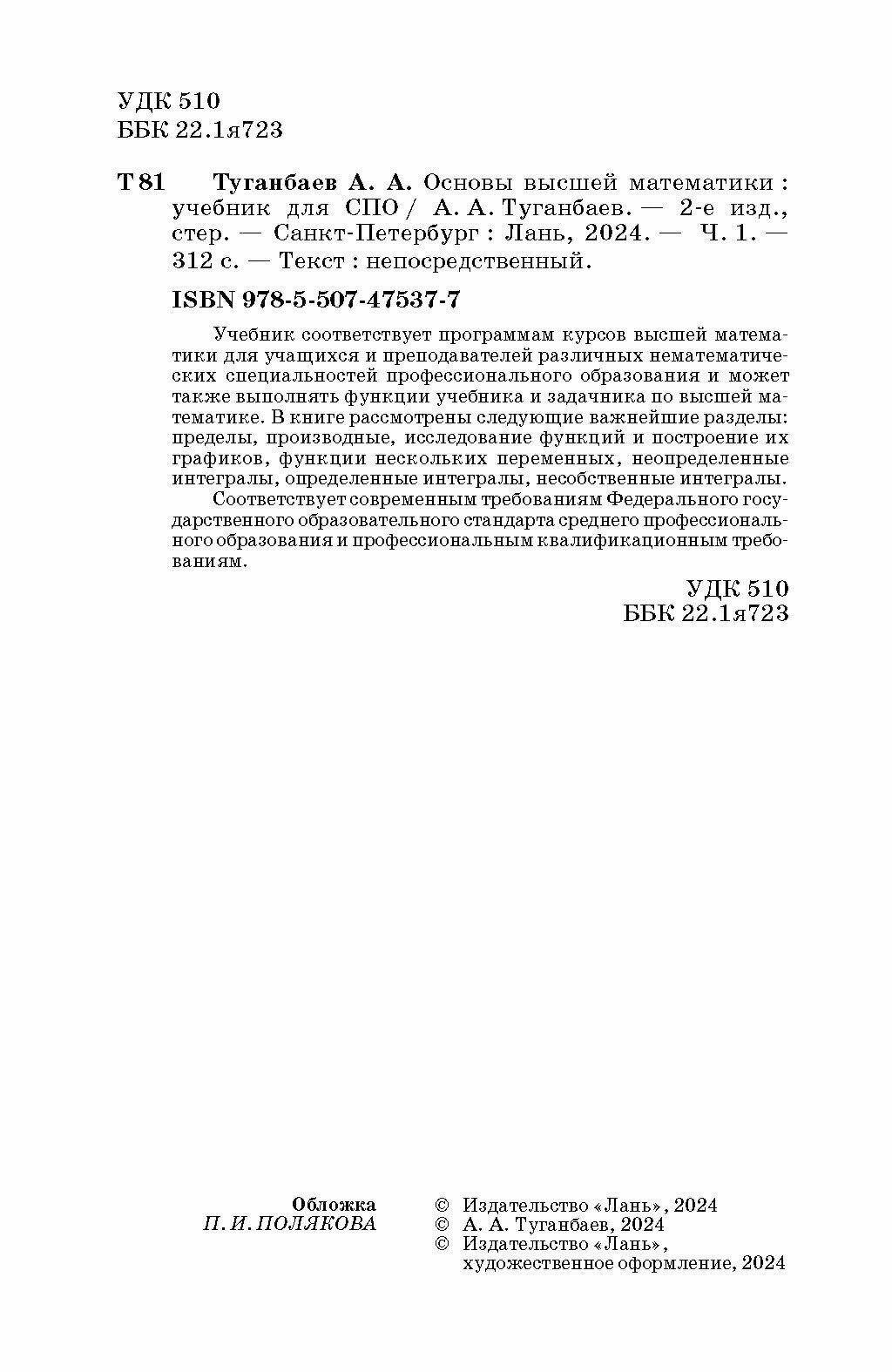 Основы высшей математики. Часть 1. Учебник. СПО (А. А. Туганбаев); Издательство ЛАНЬ, 2024