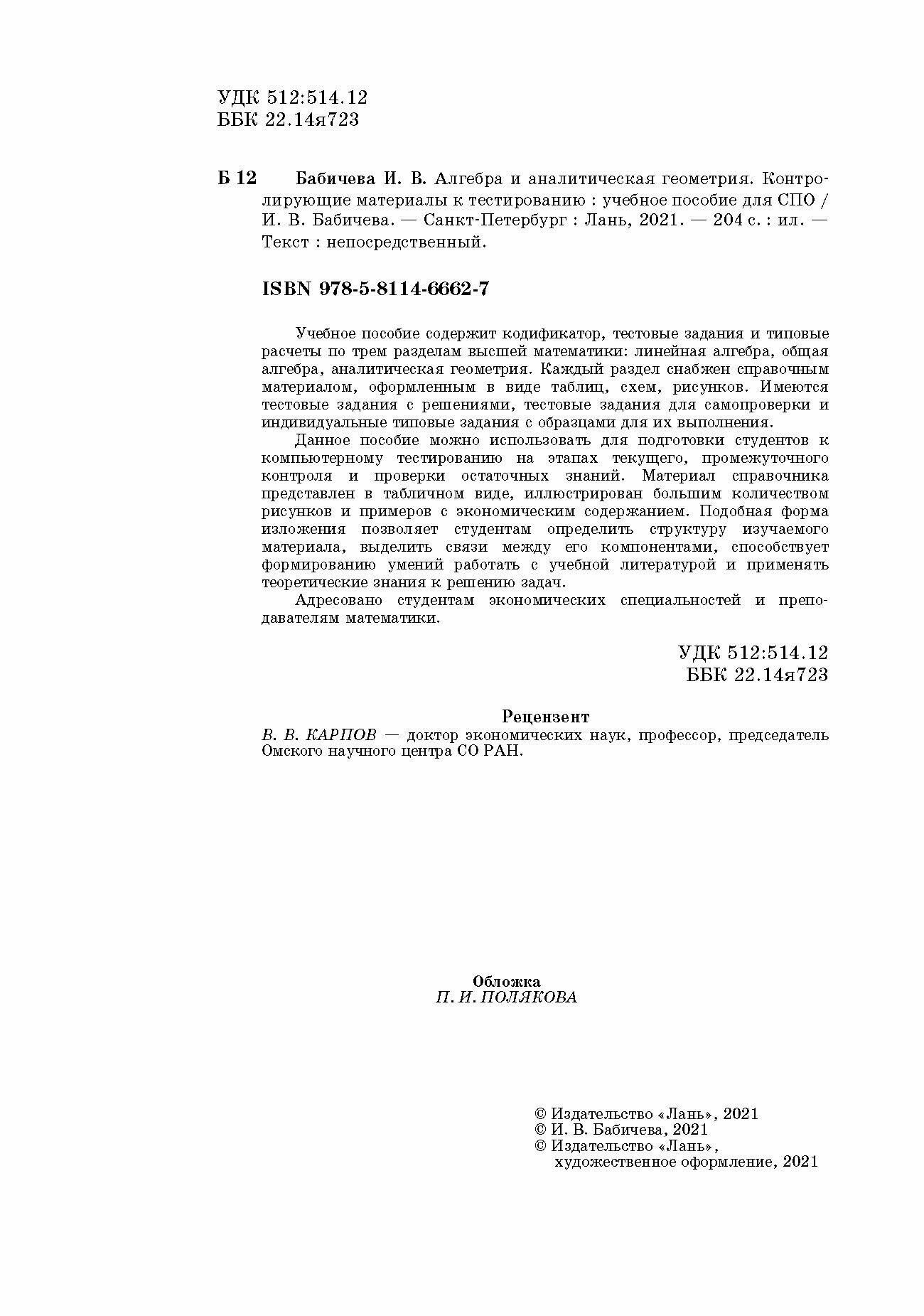 Алгебра и аналитическая геометрия. СПО (И. В. Бабичева); Издательство ЛАНЬ, 2021
