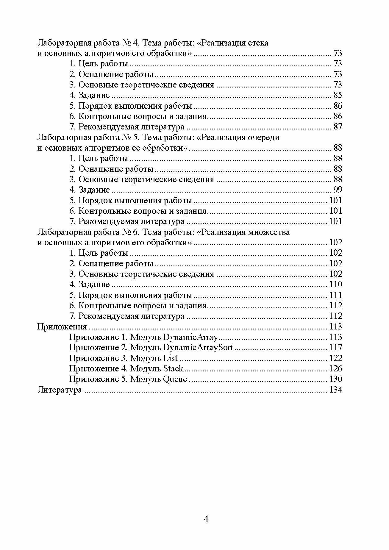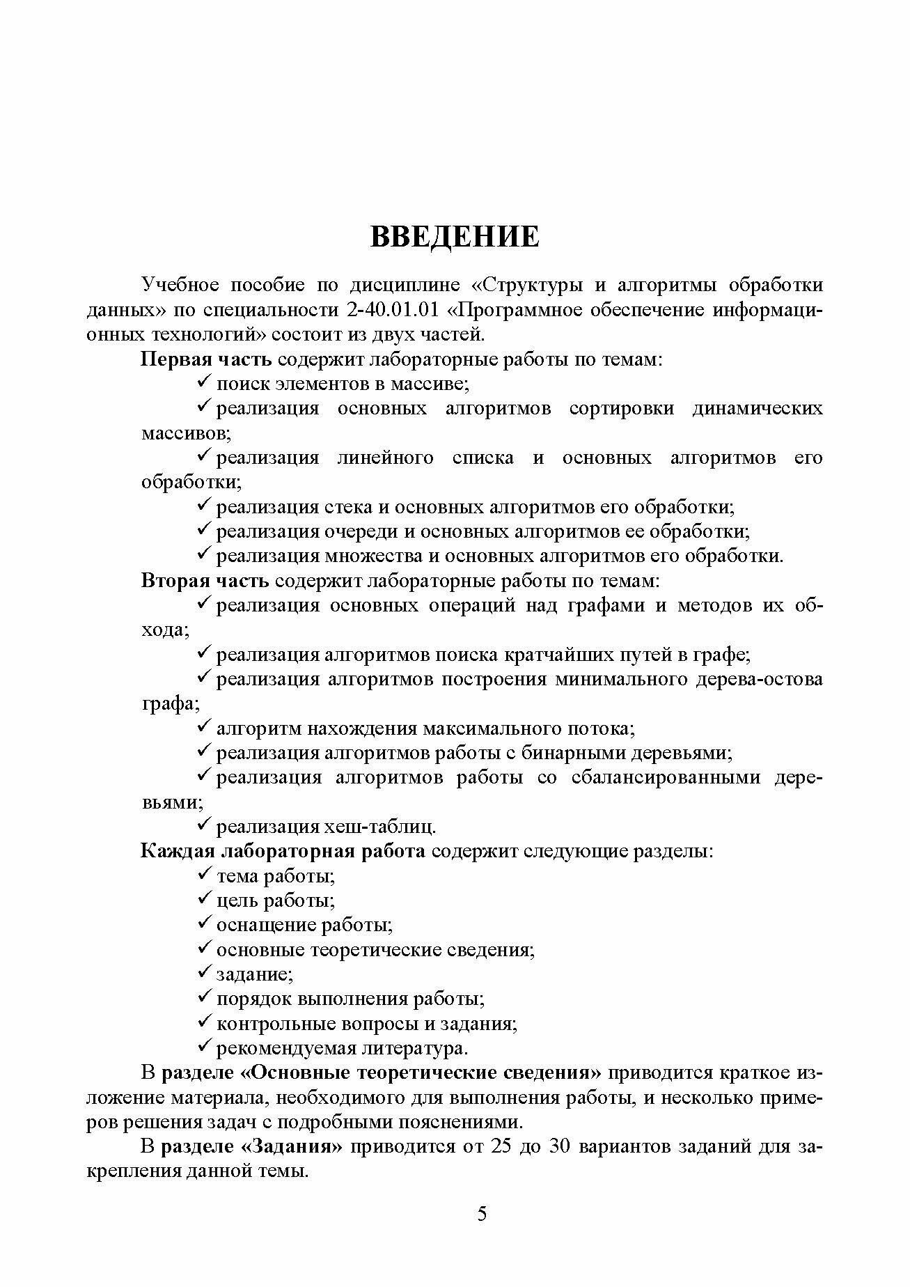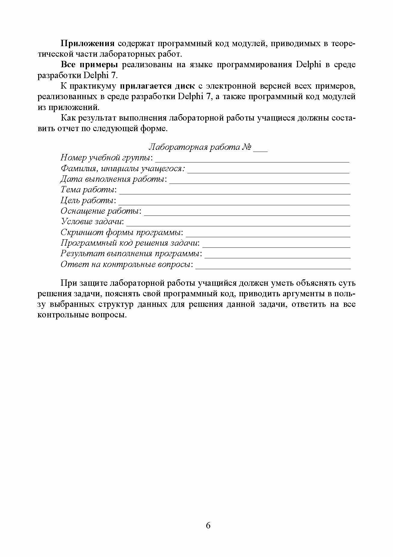 Учебное пособие содержит 6 лабораторных работ, посвященных линейным структурам данных. Среди них динамические массивы, односвязный линейный список, стек, очередь, множества. В лабораторных работах предлагается 30 вариантов заданий для закрепления темы лабораторной работы. Каждая лабораторная работа сопровождается краткими теоретическими сведениями по теме, а также иллюстрируется решением типичных примеров. Каждый пример содержит условие задачи, изложение алгоритма (принципа) решения задачи, макет формы с описанием необходимых компонентов, листинг программного кода решения данной задачи. Для удобства и эффективного применения различных структур данных в учебном пособии предлагаются программные модули реализации следующих структур: динамический массив, сортировка динамических массивов, линейный список, стек, очередь. Программный код данных модулей приводится в приложении.