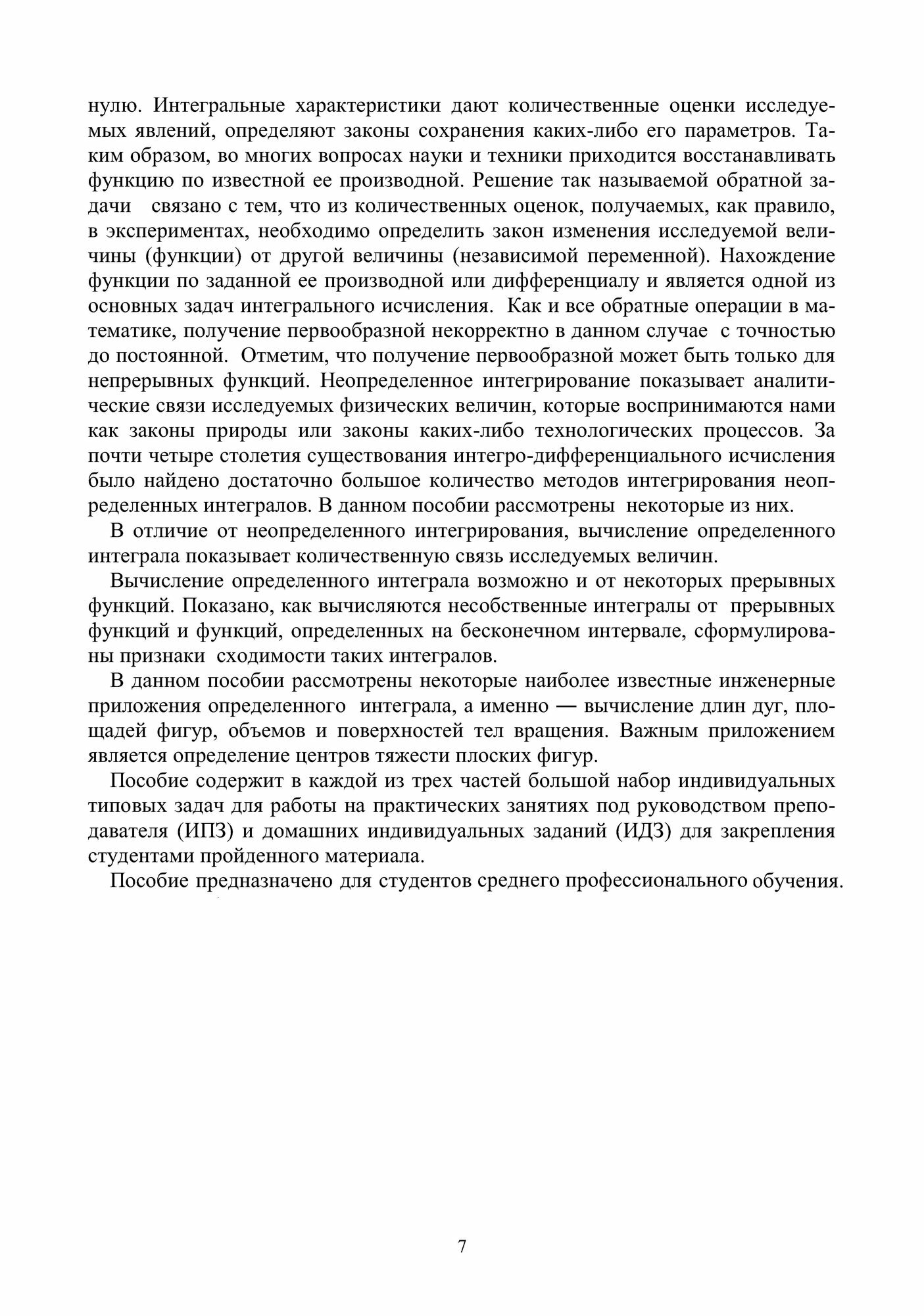 Пособие содержит тщательно разобранные примеры, геометрические иллюстрации и приложения. Рассмотрены вопросы интегрального исчисления функции одной переменной и его технические приложения. Даны приложения интегрального исчисления к задачам геометрии, теоретической механики и физики.
