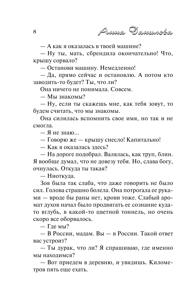 Зоя открыла глаза и ужаснулась - видавшая виды развалюха-жигули, сзади - белый кот с зелеными глазами, за рулем - неизвестная личность жуткого вида со всеми следами алкогольного отравления, при этом у девушки - дикая головная боль и полное отсутствие понятия о том, кто ты, откуда и что здесь делаешь…Недолгое пребывание в запущенном деревенском доме поставило Зою перед очень сложным выбором: играть по правилам тех, кто мнит себя кукловодами, или написать собственный сценарий...