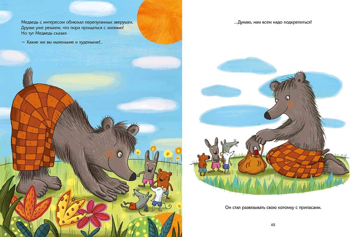 В сказке «Осторожно, Медведь!» Мышонок и его друзья, придя однажды утром на любимую поляну, увидели на ней нечто незнакомое и странное. При ближайшем рассмотрении оказалось, что это медведь, который спал под деревом. Друзья с опаской оглядели лохматое чудище, его огромные лапы, толстый живот и мохнатую шерсть. Такое страшилище наверняка очень опасное и злое – подумали они. Они были уверены, что если медведь проснется, то наверняка их съест. Но только они собрались бежать, как медведь проснулся, сгрёб их всех в охапку и… прорычав «Как же я проголодался!» усадил рядом и угостил вкусным обедом. Отличный получился пикник, а Мышонок и его товарищи обрели нового друга.
