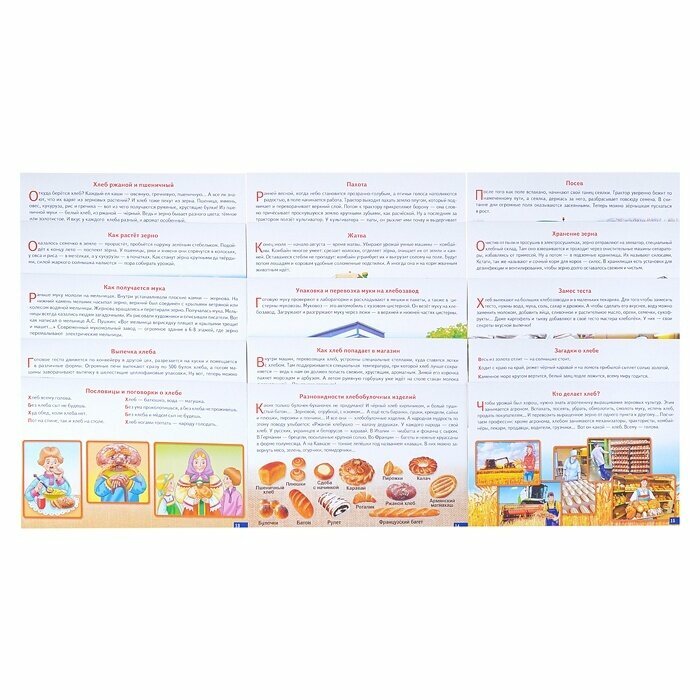 Отличные карточки! В детском саду организовали проект "Хлеб всему голова". Эти карточки идеально подошли для изучения. В пособии есть карточки, которые рассказывают об этапах выращивания хлеба: пахота, посев, жатва и т.д. Мы рассматривали, куда попадают зернышки после жатвы, что с ними случается на мельнице и мукомольном заводе. Есть карточки о многообразии хлебобулочных изделий, пословицы и поговорки. Небольшой текст с объяснением сопровождает каждую карточку. Для ребенка очень интересно и познавательно!