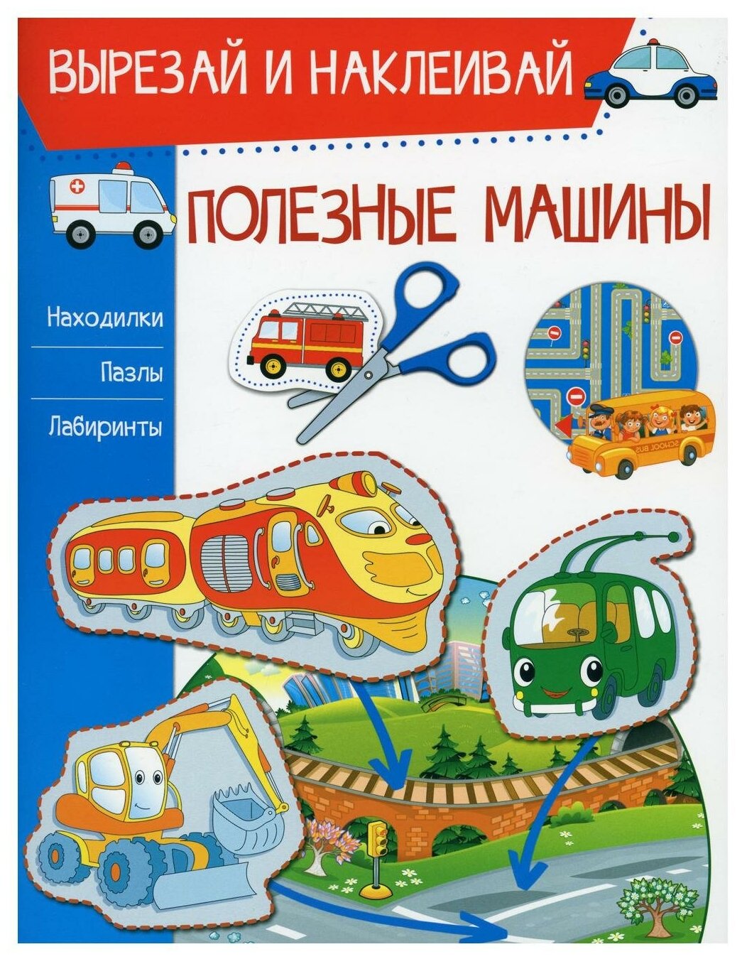В книге «Полезные машины» проходим лабиринты, продолжаем последовательность, составляем пазлы, выполняем задания на логику, находим пары, собираем части целого и, конечно, вырезаем и наклеиваем!