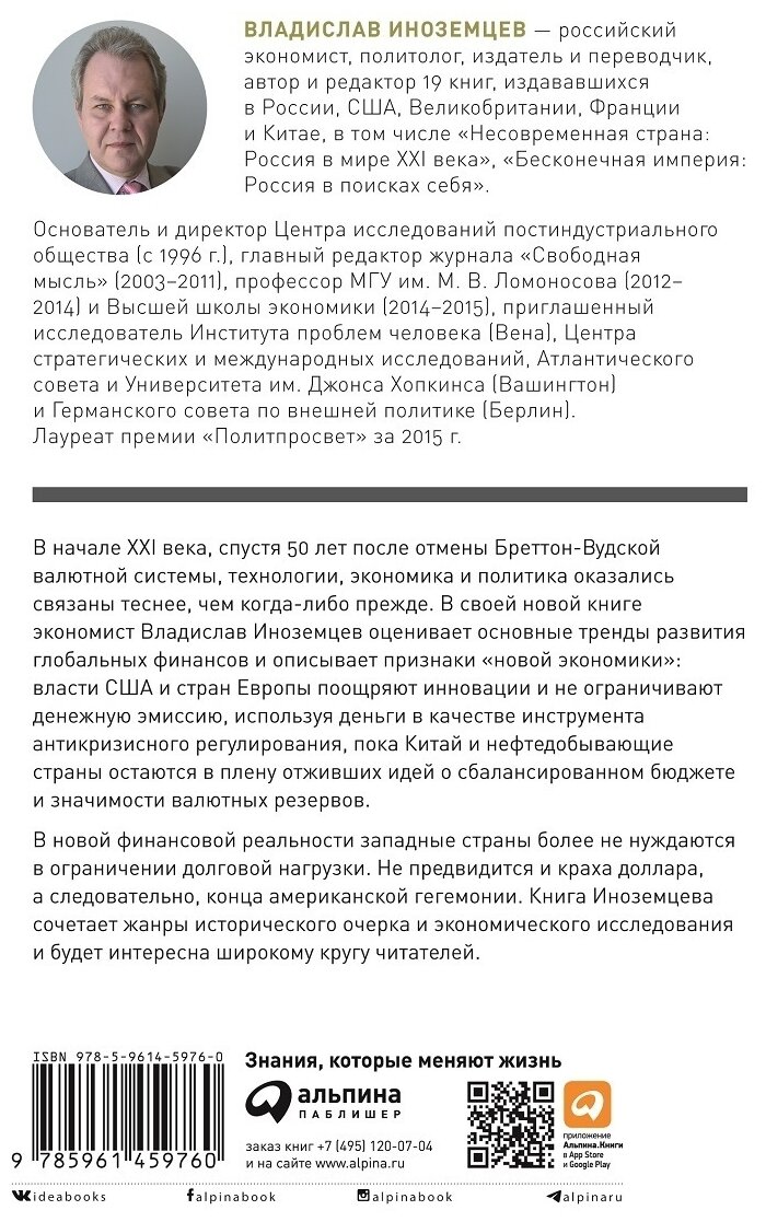 В начале XXI века, спустя 50 лет после отмены Бреттон-Вудской валютной системы, технологии, экономика и политика оказались связаны теснее, чем когда-либо прежде. В своей новой книге экономист Владислав Иноземцев оценивает основные тренды развития глобальных финансов и описывает признаки «новой экономики»: власти США и стран Европы поощряют инновации и не ограничивают денежную эмиссию, используя деньги в качестве инструмента антикризисного регулирования, пока Китай и нефтедобывающие страны остаются в плену отживших идей о сбалансированном бюджете и значимости валютных резервов. В новой финансовой реальности западные страны более не нуждаются в ограничении долговой нагрузки. Не предвидится и краха доллара, а следовательно, конца американской гегемонии. Книга Иноземцева сочетает жанры исторического очерка и экономического исследования и будет интересна широкому кругу читателей.