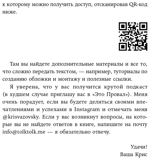 Сегодня подкасты слушают, обсуждают и записывают, кажется, вообще все. Авторские аудиоблоги на самые разные темы уверенно теснят радио. Каждый, кто привык включать по дороге на работу очередной эпизод любимого подкаста, наверняка не раз задумывался о собственном. Но с чего начать? Кристина Вазовски - основательница студии «ТОЛК», выпускает подкасты на русском языке, которые входят в топ Apple Podcasts. В своей книге она рассказывает, как сделать свой проект с нуля с минимальными вложениями - от выбора оборудования, подготовки к интервью и монтажа до развития и монетизации. Не удивляйтесь, но для начала вам хватит смартфона и... носка. Вы научитесь основам сценарного дела, начнете разбираться в многообразии микрофонов и рекордеров, освоите навыки сторителлинга и даже справитесь со страхом публичных выступлений. Но если вдруг вы поймете, что не можете думать ни о чем, кроме своего подкаста, то знайте: сделать подкастинг основным источником заработка совершенно реально.