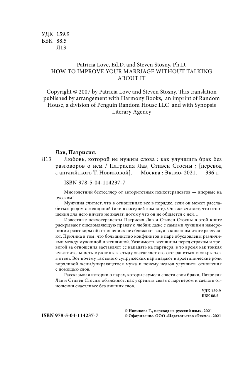 Сервис сравнения цен СкидкаГИД предлагает сравнить цены на товар «Книга: Любовь которой не нужны слова. Как улучшить брак без разговоров о нем (Лав Патрисия, Стосны Cтивен); ООО "Издательство "Эксмо", 2021»