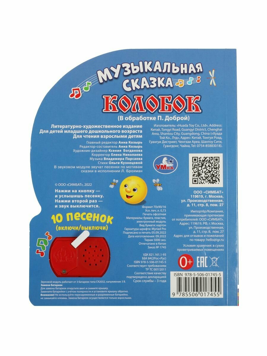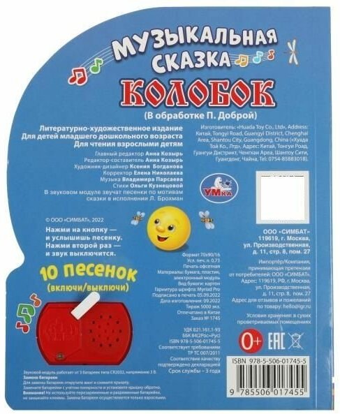 Сервис сравнения цен СкидкаГИД предлагает сравнить цены на товар «Книга: Колобок (1 кнопка с 10 пеcенками). Формат: 175х205мм. Объем: 10 картонных страниц в кор.24шт (Юлия Зайцева); Симбат, 2023»