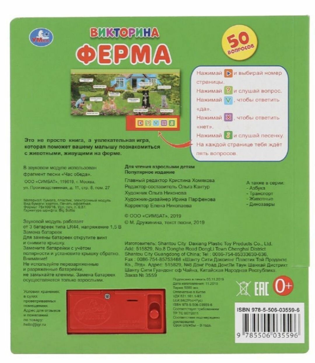 "Умка". Ферма. Викторина (5 звук. кнопок). Формат: 200х175мм. Объем: 10 карт. стр. в кор.32шт (Рахманова С.); СИМБАТ, 2019