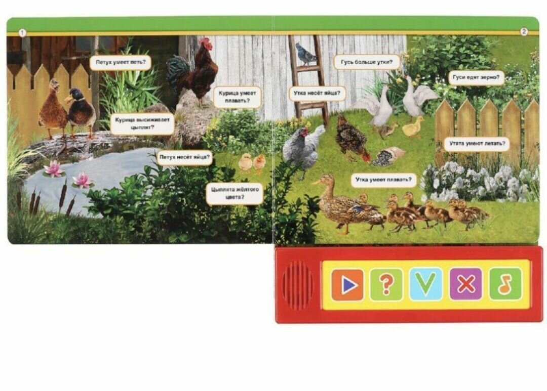Книга в лёгкой игровой форме познакомит малыша с животными, которые живут на ферме. Для закрепления полученных знаний предлагается ответить на вопросы викторины, используя функциональные кнопки на панели снизу. Благодаря компактному формату книгу удобно взять с собой в дорогу.