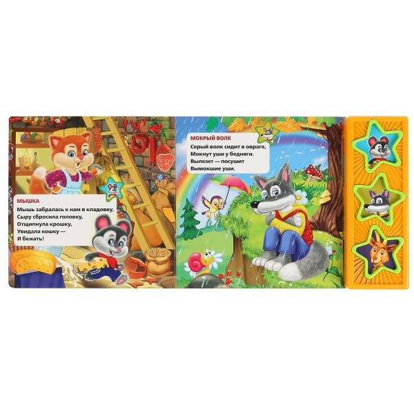 С помощью этой музыкальной книги ребёнок познакомится с разными животными. Малыш с удовольствием будет нажимать на звёздочки и слушать песенки. Книжка сделана из плотного картона, поэтому родители могут не опасаться за её сохранность. Благодаря компактному формату её удобно брать с собой.