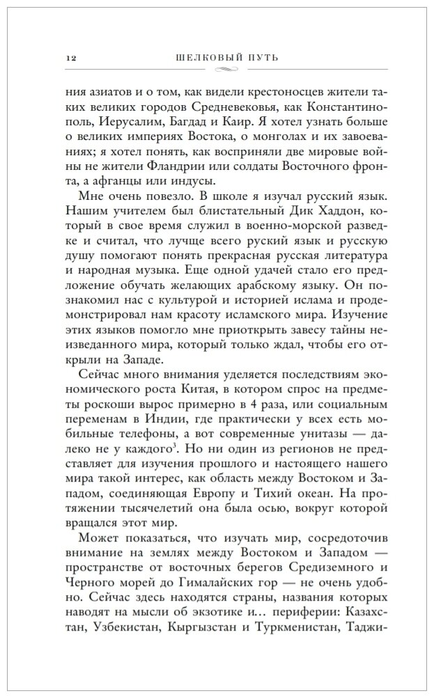 Эти пути являются центральной нервной системой мира. Они соединяют народы и города. При этом данные связи находятся в глубине и недоступны для невооруженного взгляда. Так же как анатомия объясняет функции организма, правильное рассмотрение этих связей позволит понять основные механизмы работы целого мира. И все же, несмотря на всю важность этой части мира, она была забыта в рамках основного курса истории. Частично это произошло из-за того, что называют «ориентализмом» – из-за резко негативного взгляда на Восток как на периферийную часть мира, которой нечего противопоставить Западу и, следовательно, которая не стоит серьезного изучения. Также это связано с тем, что повествование о прошлом настолько укоренилось в умах, что Восток рассматривается исключительно как фон для истории о подъеме Европы и западного мира.