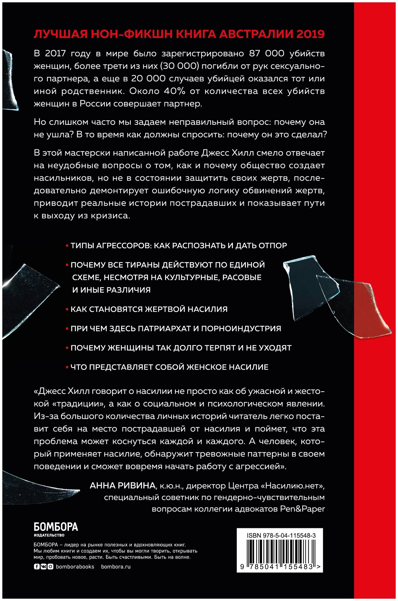книга задает много неудобных вопросов, и дает исчерпывающие ответы. ситуация с домашним насилием в Австралии (родине автора) вопиющая, здесь наши страны похожи, и я рада, что эту книгу перевели на русский. очень сильное и нужное многим исследование проблемы домашнего насилия, читать обязательно, для профилактики тоже будет полезно. потому что женщины часто запутываются, выдают желаемое за действительно, уходят в отрицание того, что происходит в их отношениях..