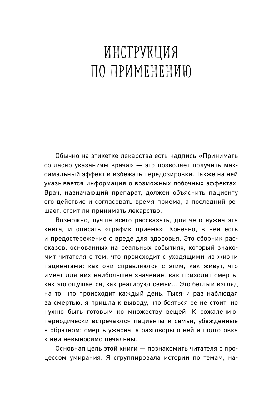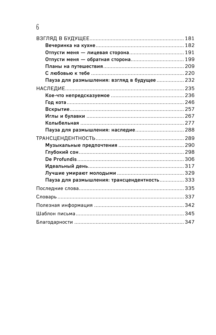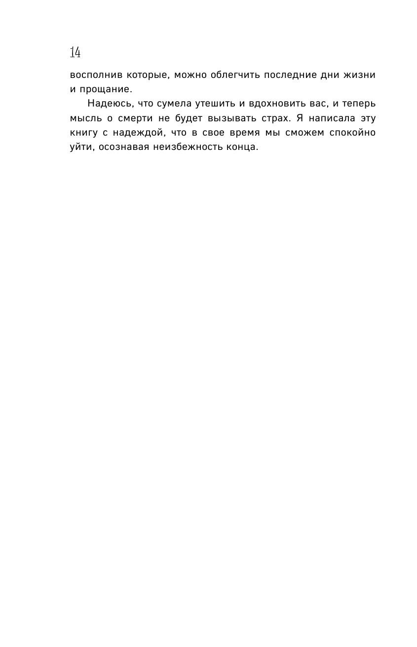 "Стоит воспринимать эту книгу как своего рода лекарство. Возможно, в процессе будет горько, но в результате терапии оно принесет облегчение и принятие естественных вещей". Очень зацепила эта фраза. Читая книгу, я будто проходила терапию. В конце каждой части есть советы, о чем подумать и что лучше обсудить с кем-то. Все рекомендации основаны на клинических исследованиях. И терапевтический эффект от книги точно есть! Полностью побороть страх смерти, наверное, невозможно. Но меньше бояться и тревожиться можно! И ко многому можно быть готовым. Очень тронуло, в самом конце книги есть пример письма, чтобы сказать любимым людям о том, как они важны для нас. Даже если не думать о смерти своей или близких, это письмо стоит того, чтобы его написать.