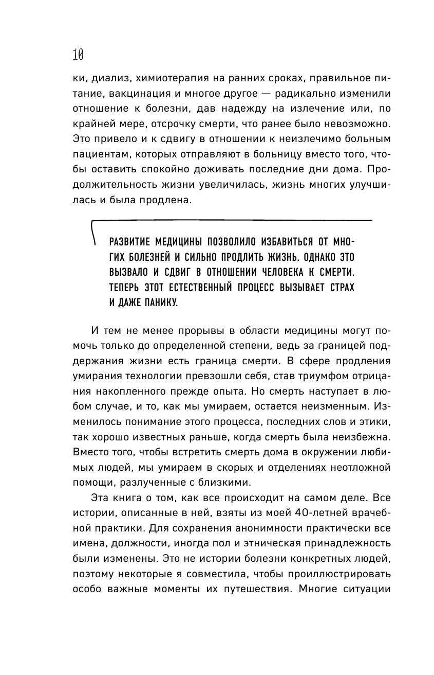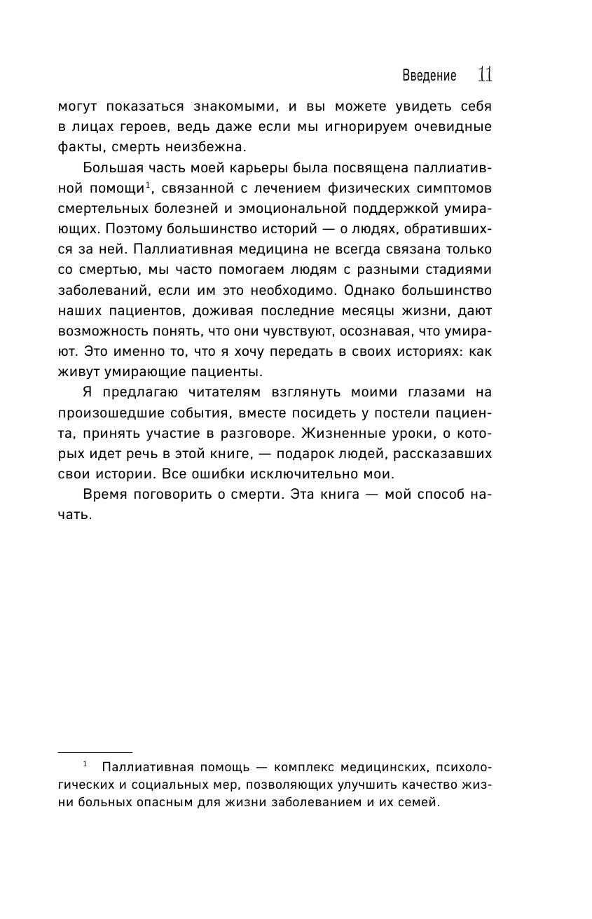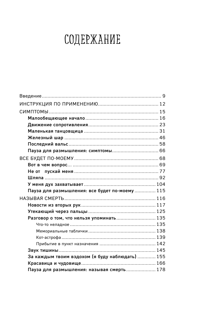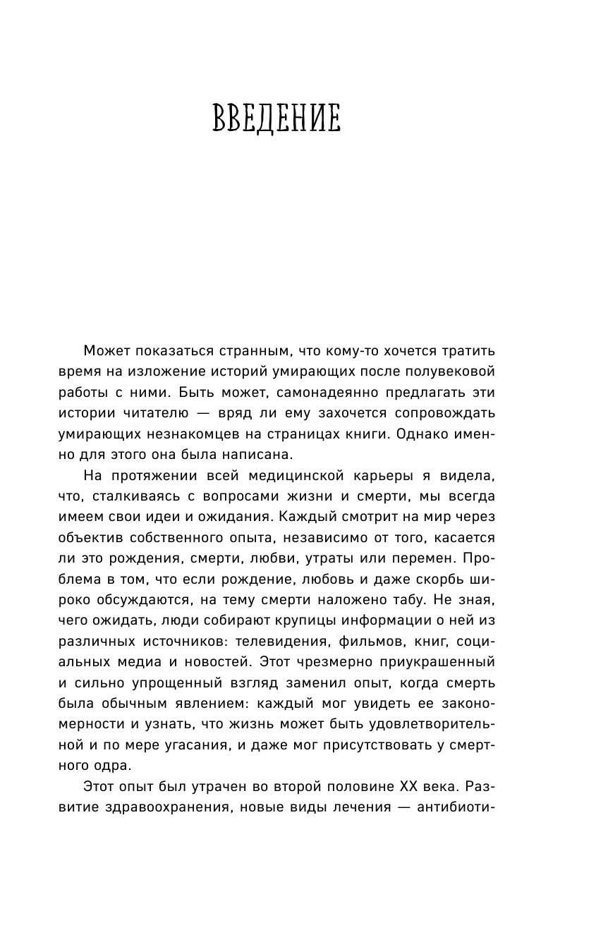 "Стоит воспринимать эту книгу как своего рода лекарство. Возможно, в процессе будет горько, но в результате терапии оно принесет облегчение и принятие естественных вещей". Очень зацепила эта фраза. Читая книгу, я будто проходила терапию. В конце каждой части есть советы, о чем подумать и что лучше обсудить с кем-то. Все рекомендации основаны на клинических исследованиях. И терапевтический эффект от книги точно есть! Полностью побороть страх смерти, наверное, невозможно. Но меньше бояться и тревожиться можно! И ко многому можно быть готовым. Очень тронуло, в самом конце книги есть пример письма, чтобы сказать любимым людям о том, как они важны для нас. Даже если не думать о смерти своей или близких, это письмо стоит того, чтобы его написать.