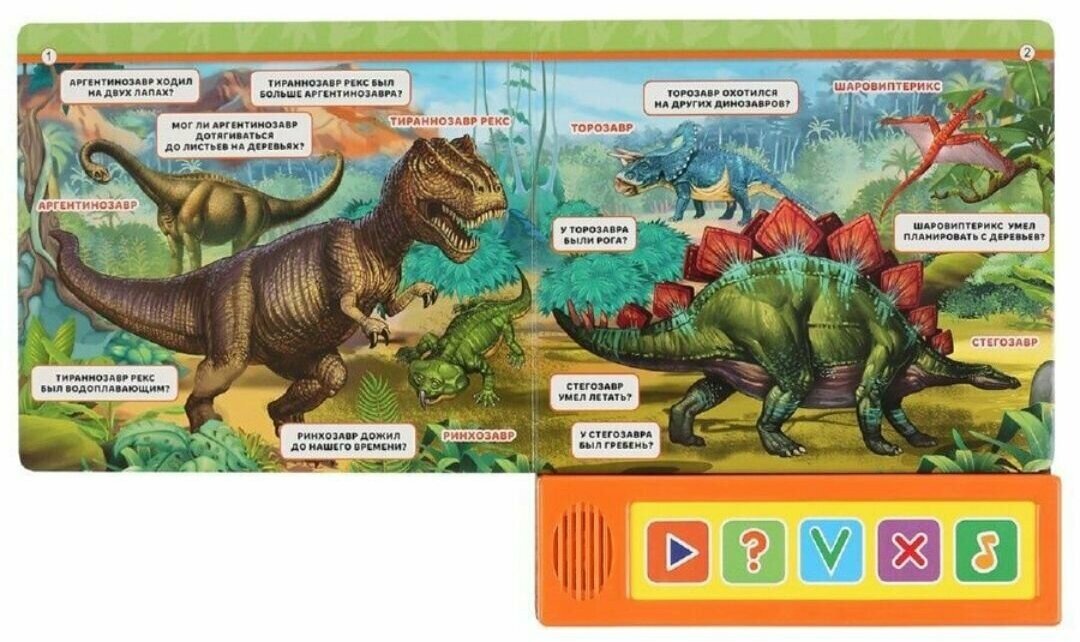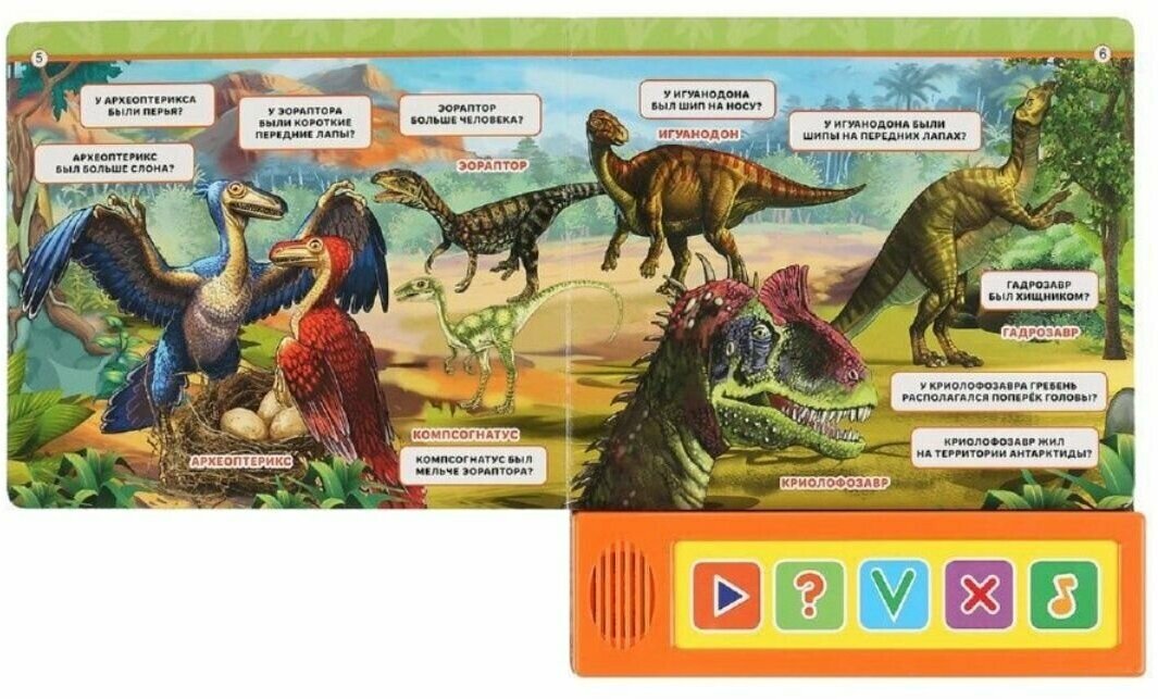 Книга в лёгкой игровой форме познакомит малыша с такими древними животными как динозавры. Для закрепления полученных знаний предлагается ответить на вопросы викторины, используя функциональные кнопки на панели снизу. Благодаря компактному формату книгу удобно взять с собой в дорогу.