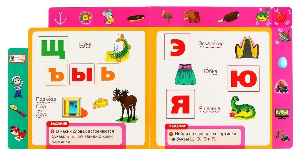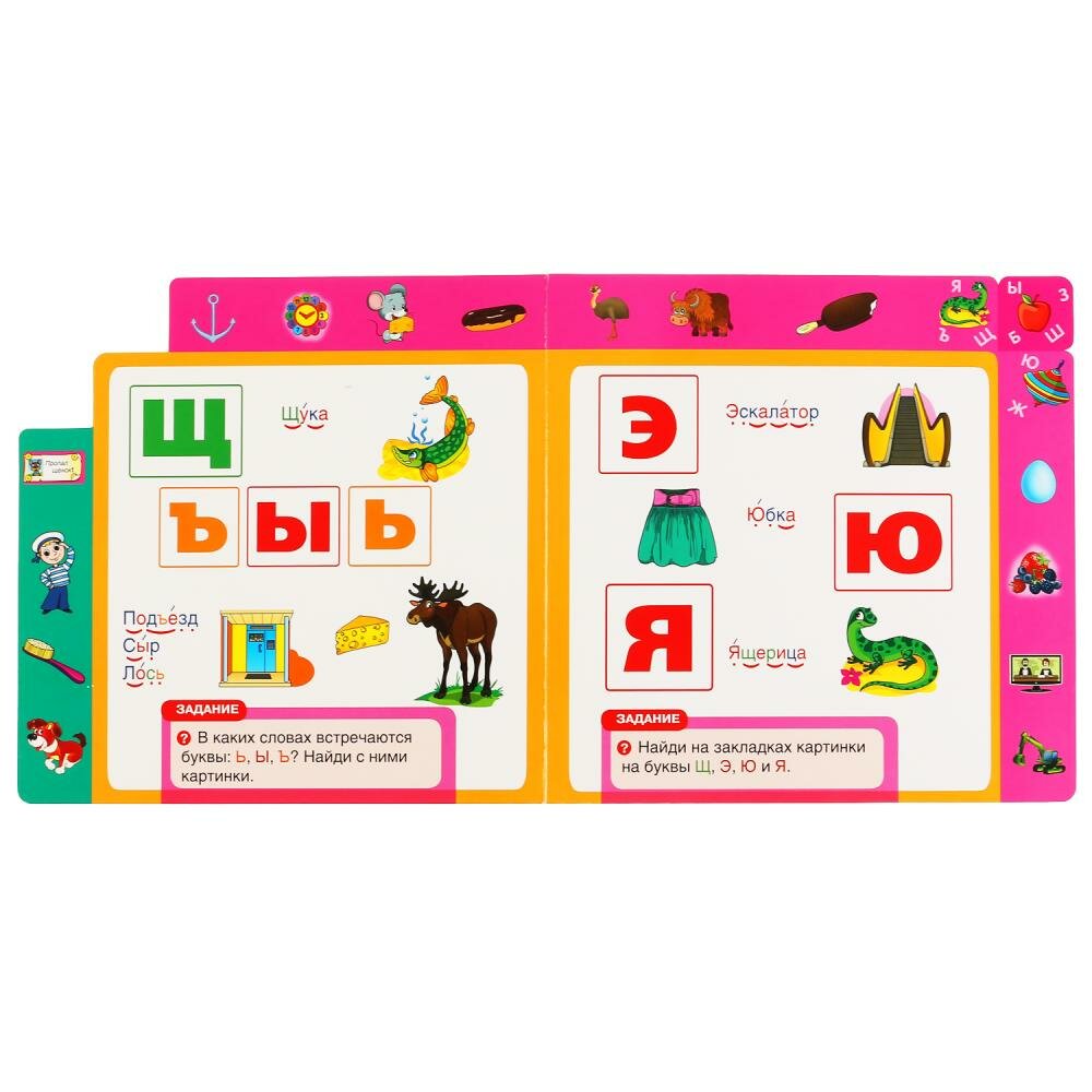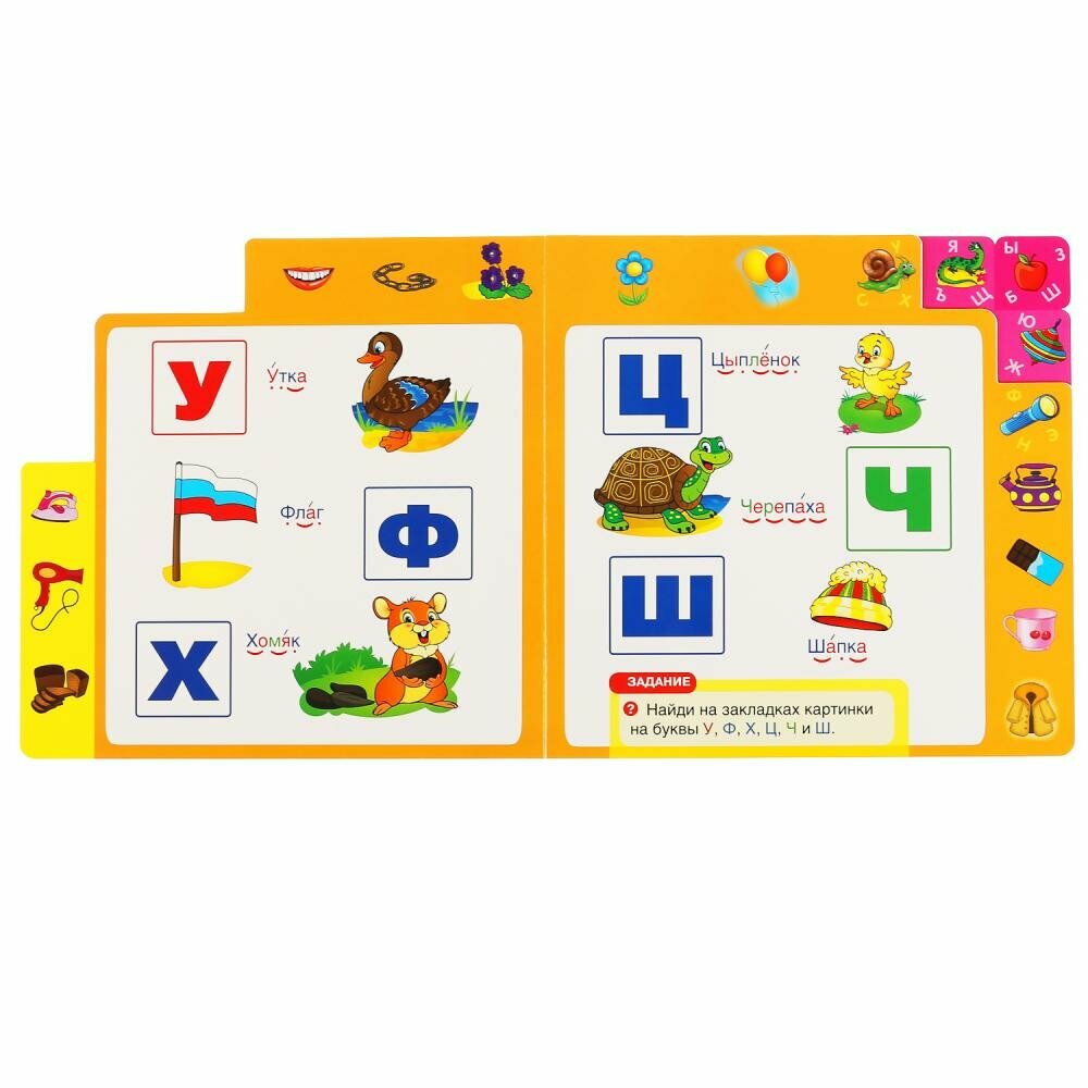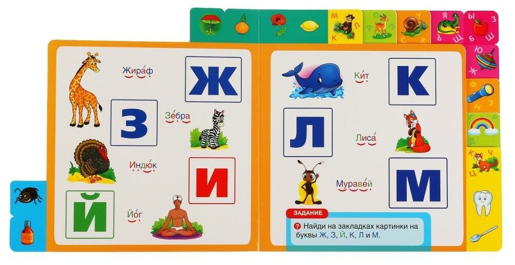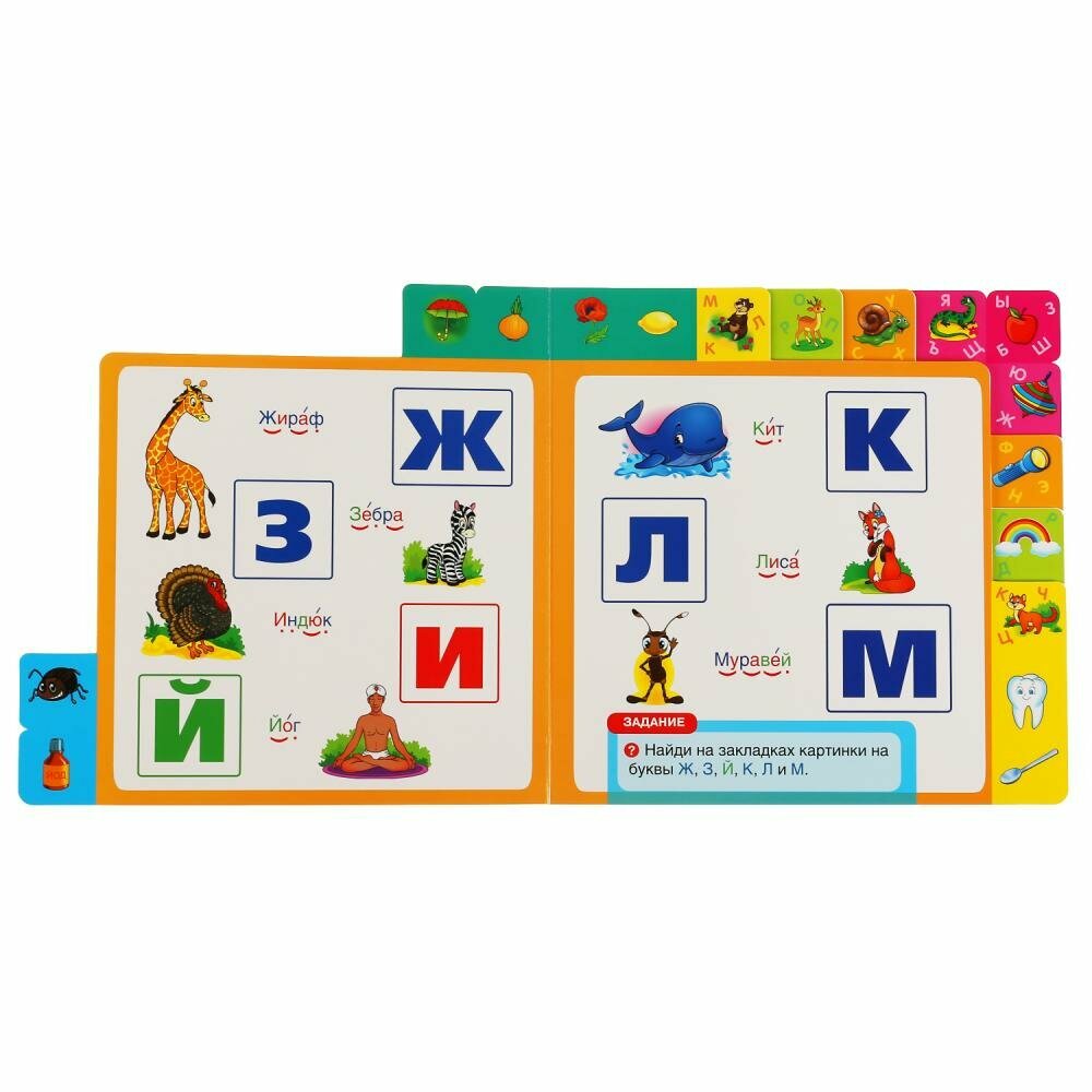 Красочная развивающая книга со страничками-закладками познакомит ребёнка с азбукой. Малыш с радостью будет рассматривать яркие иллюстрации и изучать буквы.