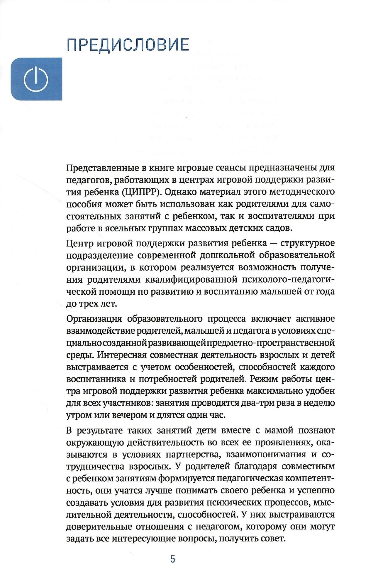 Книга поможет педагогам организовать интересные и разнообразные занятия в центре игровой поддержки развития ребенка с использованием большого количества игр и игровых упражнений, при этом для работы с группой детей потребуется всего один специалист. Кроме того, приведенные в пособии игровые сеансы помогут педагогам организовать занятия с детьми раннего возраста в дошкольной организации в адаптационный период, а также разнообразить образовательную деятельность в ясельных группах детского сада.