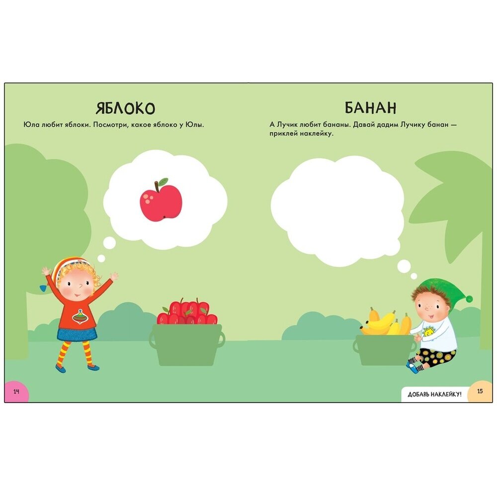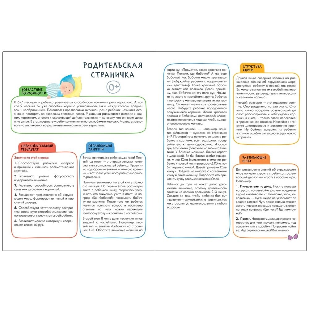 Журнал проходили с сынам уже после года, как-то мне сомнительно, что раньше ребёнок будет осознано что-то делать и клеить наклейки. После уже вполне можно, наклейки в журнале не бумажные, отличная тренировка для отклеивания от поверхности и так же в последствии от своих пальцев. Переклеивать наклейку не выйдет - бумага обычная, не мелованная. Сами задания вполне несложные, для первых проб, на каждом развороте мы видим обстановку, окружающую малыша: детская с игрушками, дом, парк, детская площадка т.д. - предметы, а наклейками надо дополнить количество этих предметов
