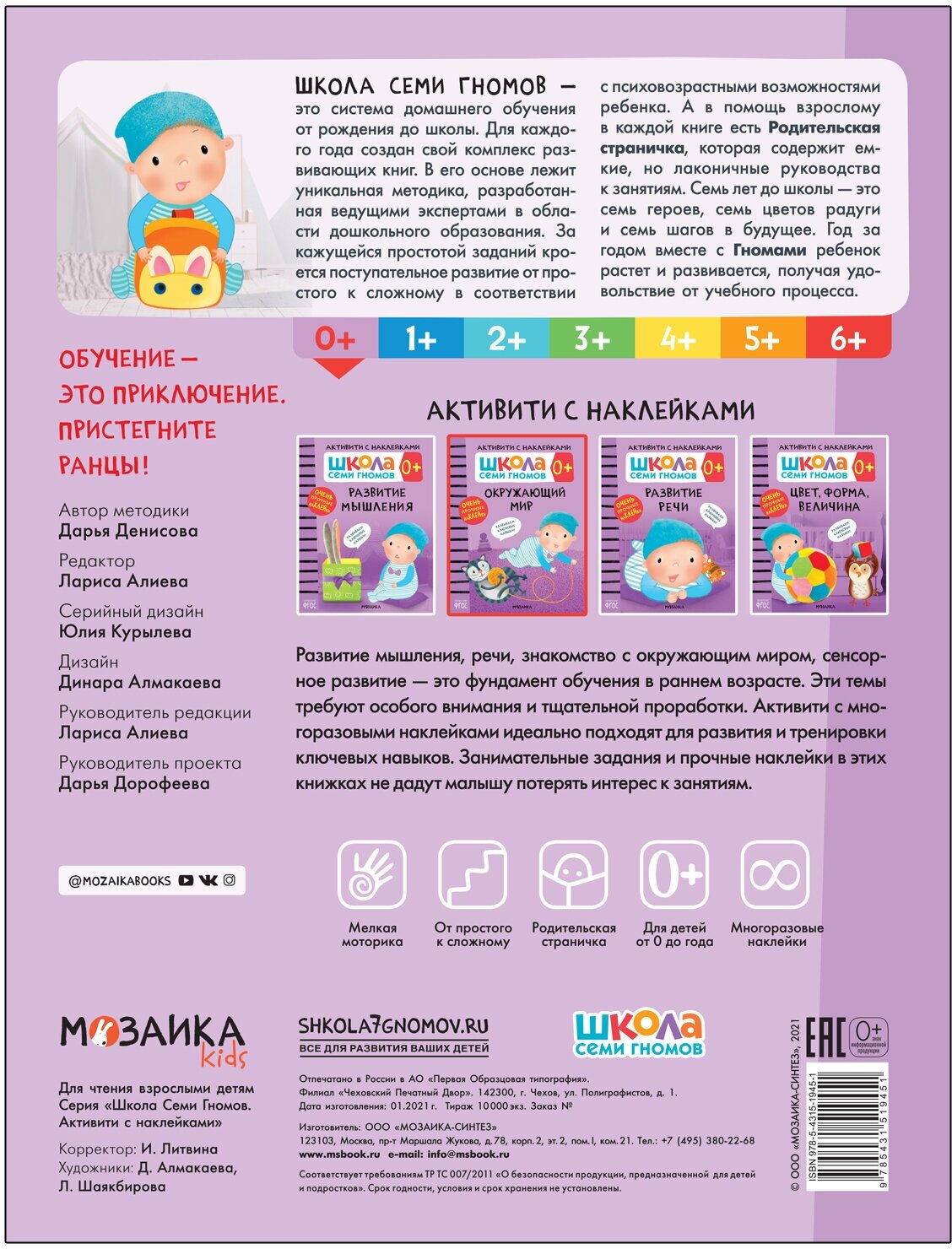 Книга «Окружающий мир 0+» из серии «Школа Семи Гномов. Активити с наклейками» предназначена для расширения кругозора и знаний об окружающем мире детей от рождения до года.