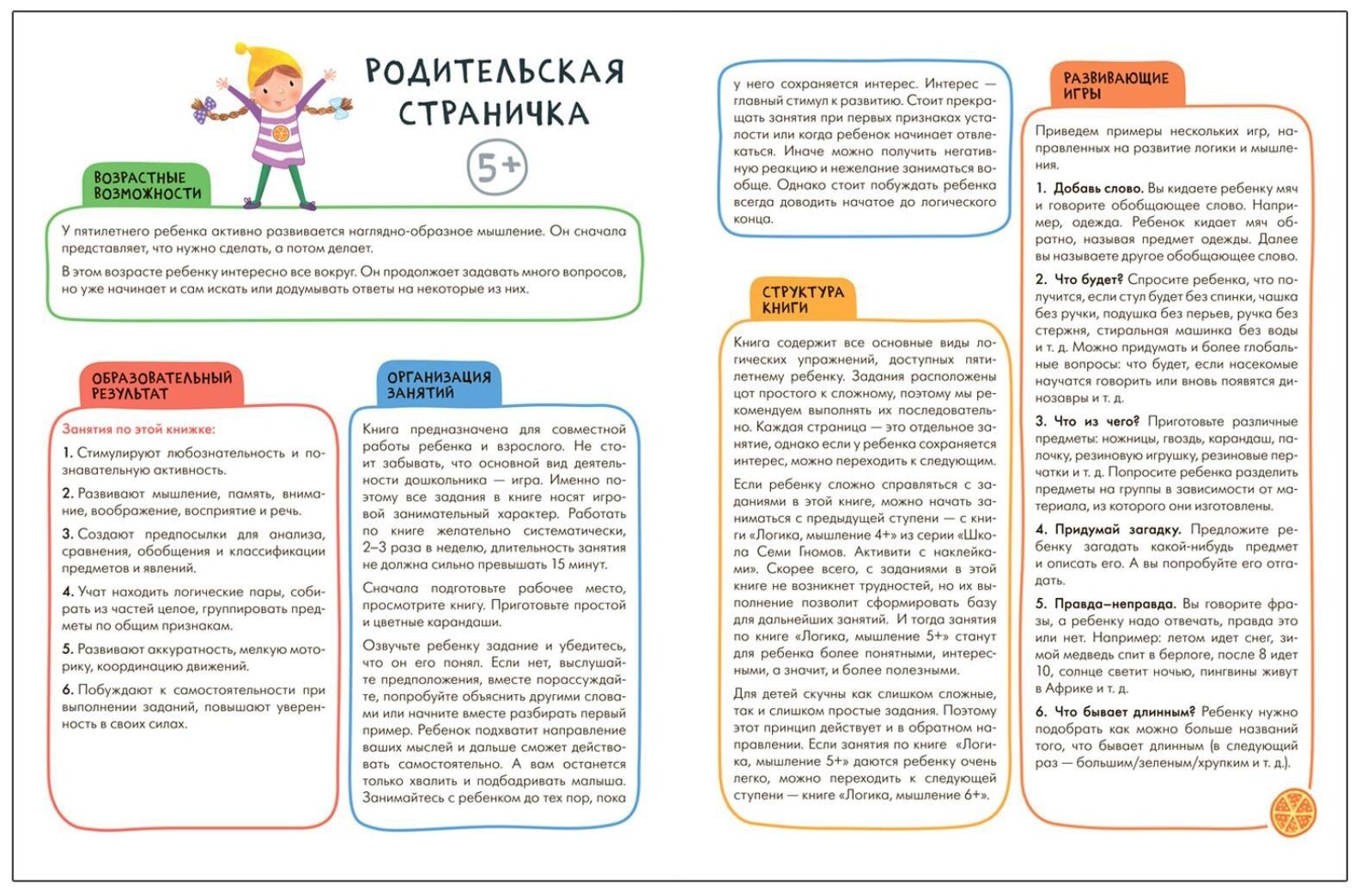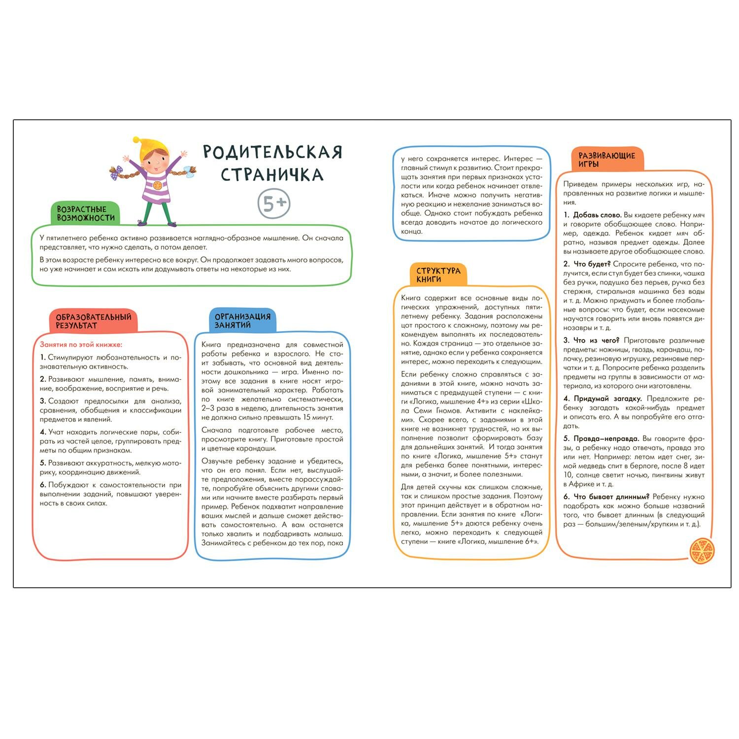 Книга «Логика, мышление 5+» из серии «Школа Семи Гномов. Активити с наклейками» предназначена для развития и тренировки логического мышления детей от 5 до 6 лет.