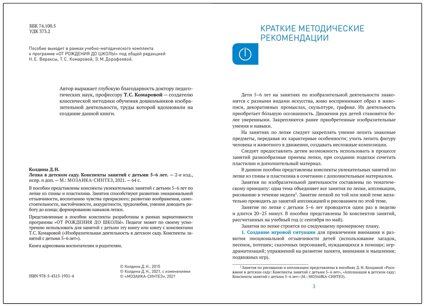 Пособие издано в рамках учебно-методического комплекта к программе «от рождения до школы».В пособии представлены конспекты увлекательных занятий с детьми 5–6 лет по лепке из глины и пластилина с использованием дополнительного материала. Занятия по изобразительной деятельности составлены по тематическому принципу: одна и та же тема объединяет все занятия по лепке, аппликации, рисованию в течение недели.Дети 5–6 лет на занятиях по изобразительной деятельности знакомятся с разными видами искусства, живо воспринимают образ в живописи, декоративных промыслах, скульптуре, графике. Закрепляются ранее приобретенные изобразительные умения и навыки. Занятия способствуют формированию у дошкольников самостоятельности, настойчивости, аккуратности, умения доводить работу до конца.Книга содержит:• методические рекомендации;