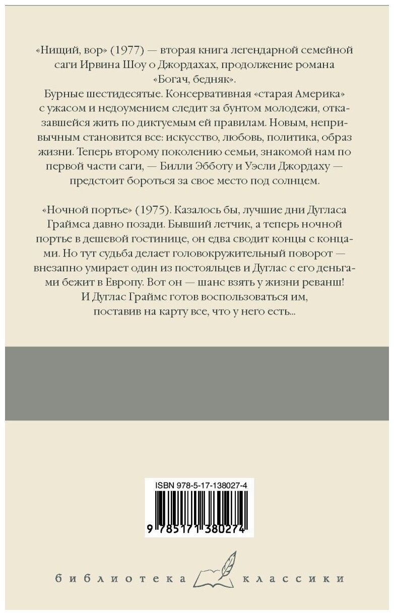 Ирвин Шоу – американский писатель 20 века с множеством интереснейших произведений и два из них входят в данный сборник, а именно романы: «Нищий, вор» и «Ночной портье». Обложка книги выполнена в твердом, матовом переплете. Цвет страниц – белый, шрифт четкий и комфортный для чтения.